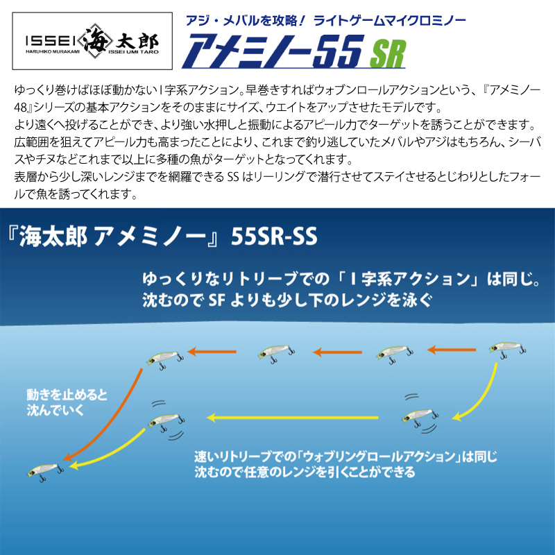 | 商品名 | アメミノー 55SR-SS 釣り 55mm 012 ソリッドライムチャート ライトゲーム専用 マイクロミノー サイズ ウエイト アップ ルアー ミノー issei イッセイ 海太郎 | ||||||||||