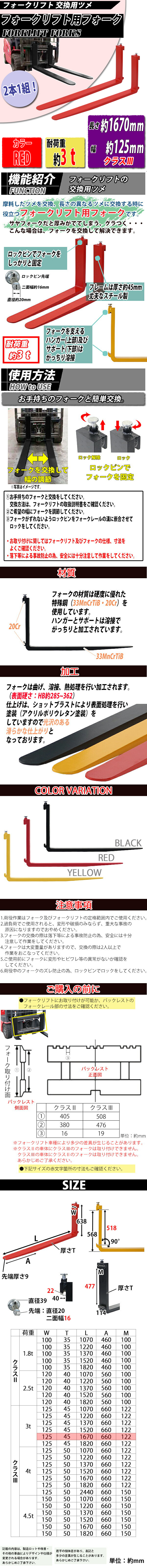 | 商品名 | 送料無料 フォーク 爪 2本セット 赤 長さ約1670mm 幅約125mm 耐荷重約3t 厚さ約45mm フォークリフト用 交換用 フォーク ツメ 耐荷重約3000Kg フォークリフト アタッチメント 運搬 荷役 交換 クラス3 レッド fork125451670 |