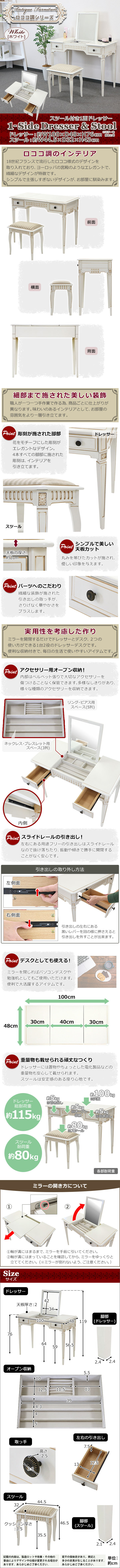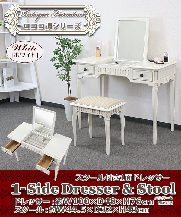 | 商品名 | 送料無料 ロココ調 ドレッサー スツール セット 天板サイズ約W100×約D48cm ホワイト ドレッサーデスク 収納 化粧台 鏡台 メイク台 鏡 ミラー 机 テーブル 木製 椅子 イス チェア 一面 1面 コスメ 小物 アンティーク インテリア 家具 リビング おしゃれ 白 rococof509513wh |
