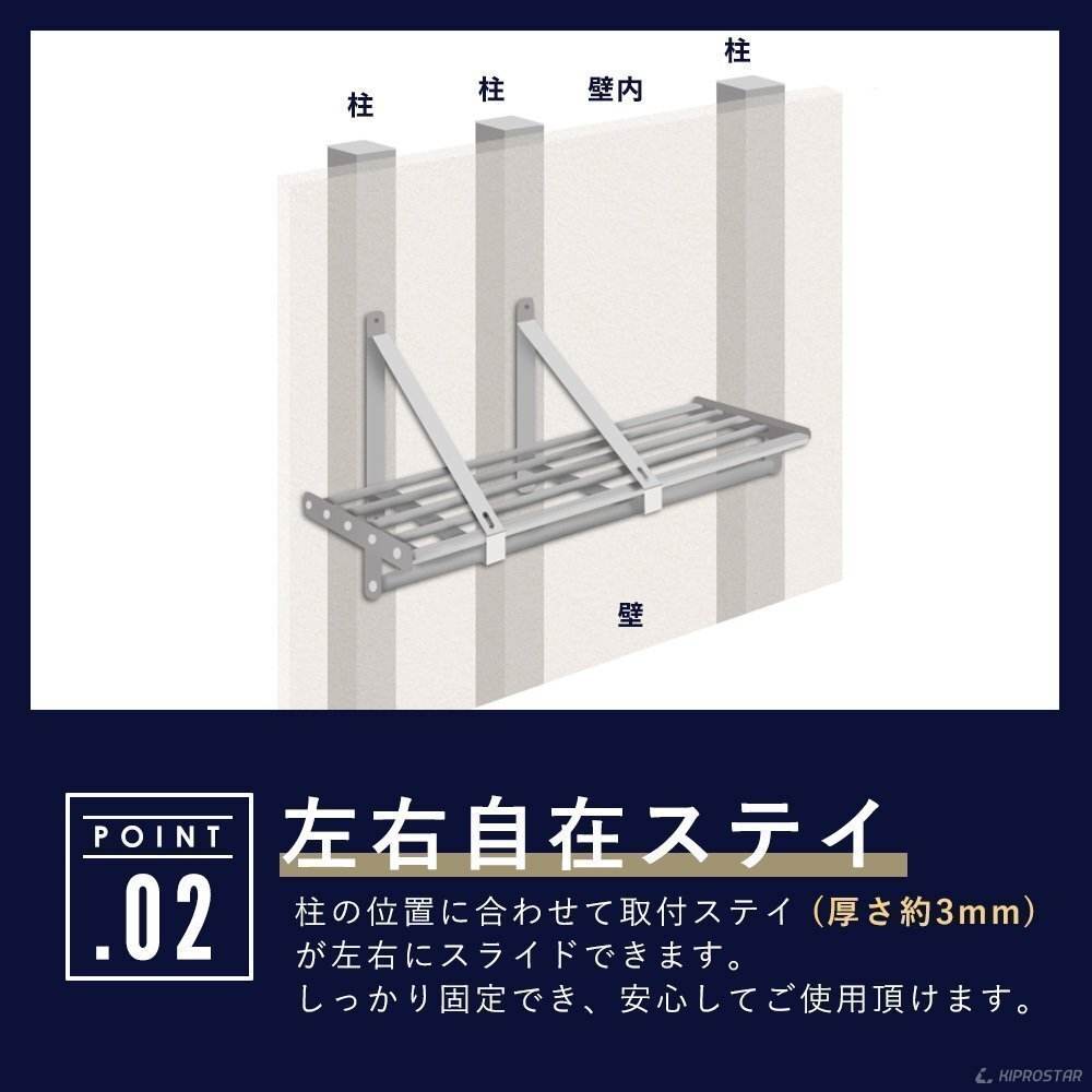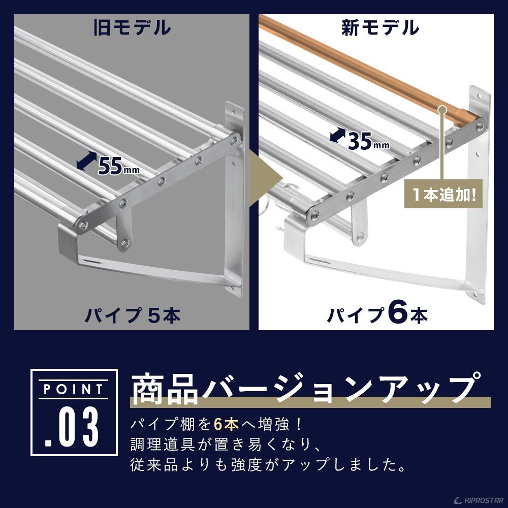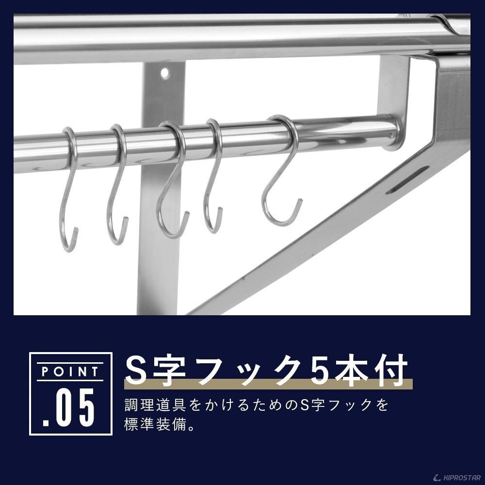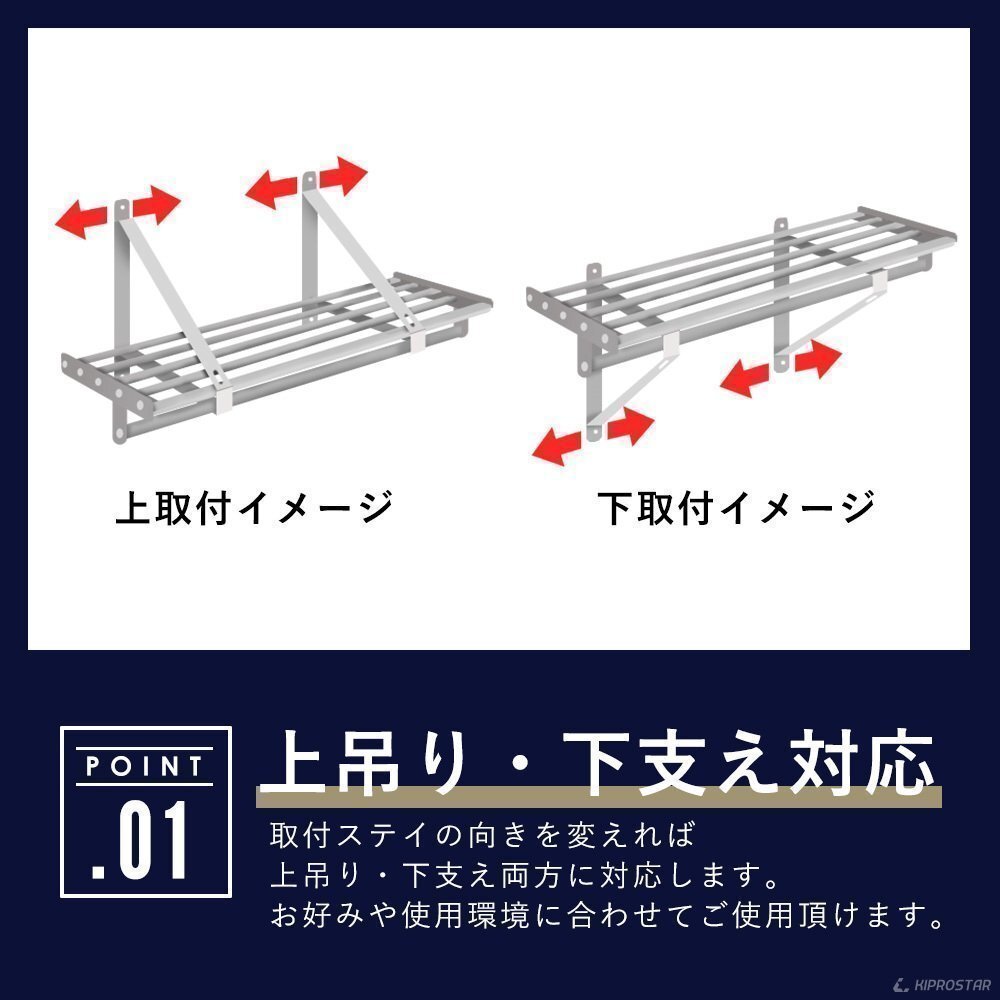 | 特長 | ・取付ステイが可動式で自由な位置に取付けられます。 ・調理道具を引っ掛ける事ができるS字フックを標準装備! ・取付ステイの向きを変えれば上吊り・下支え両方に対応します。 ※取付ステイの位置は変更できますが、本体サイズの変更は出来ません。 |