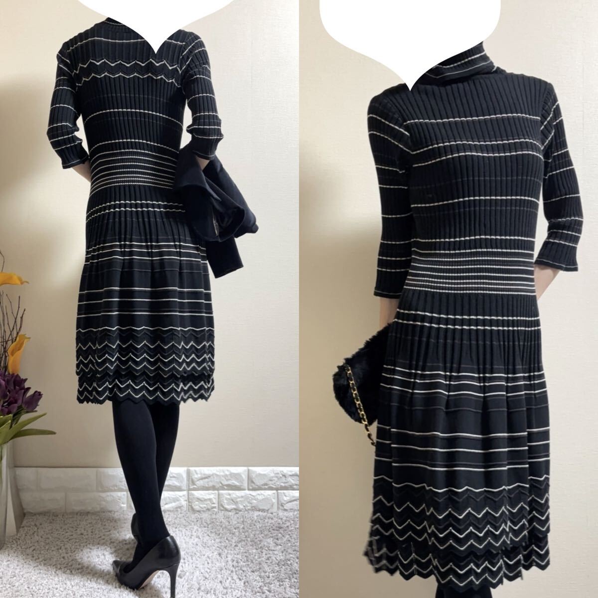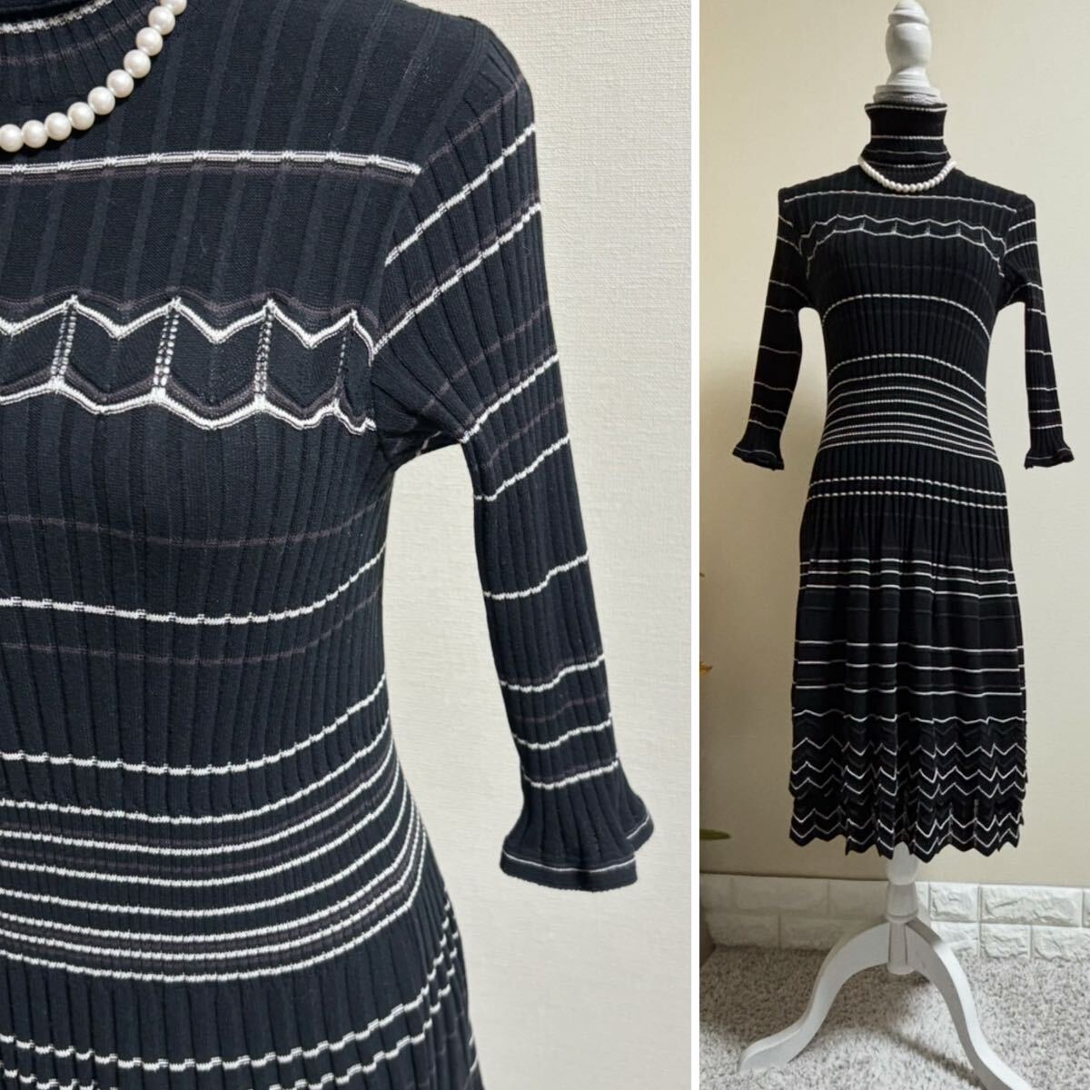 数種類の編みを組み合わせたエレガントなデザインのニットドレス ベルスリーブ七分袖ワンピースです