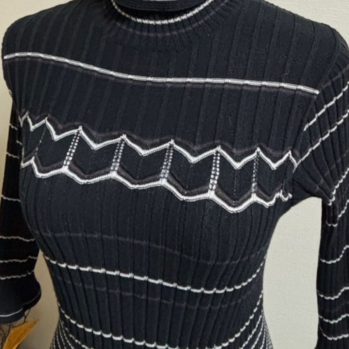 胸元幾何学柄織りの部分は透かし編み、裾はエレガントなティアードデザイン