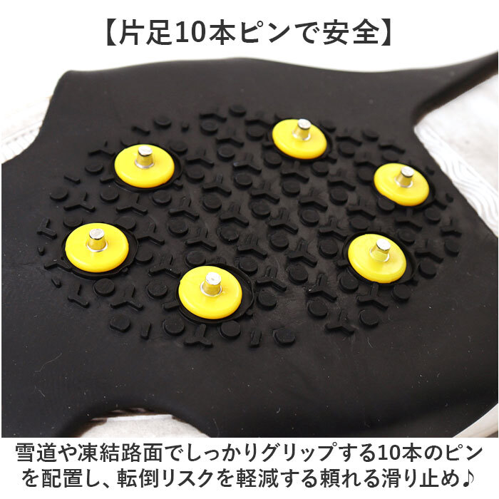 | 商品説明 | ・・【雪道も安心】 ・着脱簡単で転倒防止!冬の外出を安全にサポートする滑り止め。 ・【片足10本ピンで安全】 ・雪道や凍結路面でしっかりグリップする10本のピンを配置し、転倒リスクを軽減する頼れる滑り止め♪ ・【簡単着脱で毎日快適】 ・普段履いている靴にサッと装着できる手軽さ。 ・【男女兼用の豊富なサイズ】 ・S・M・L・XLの4サイズ展開で家族全員が使えるため、冬の外出準備がスムーズになる実用的な一品! |