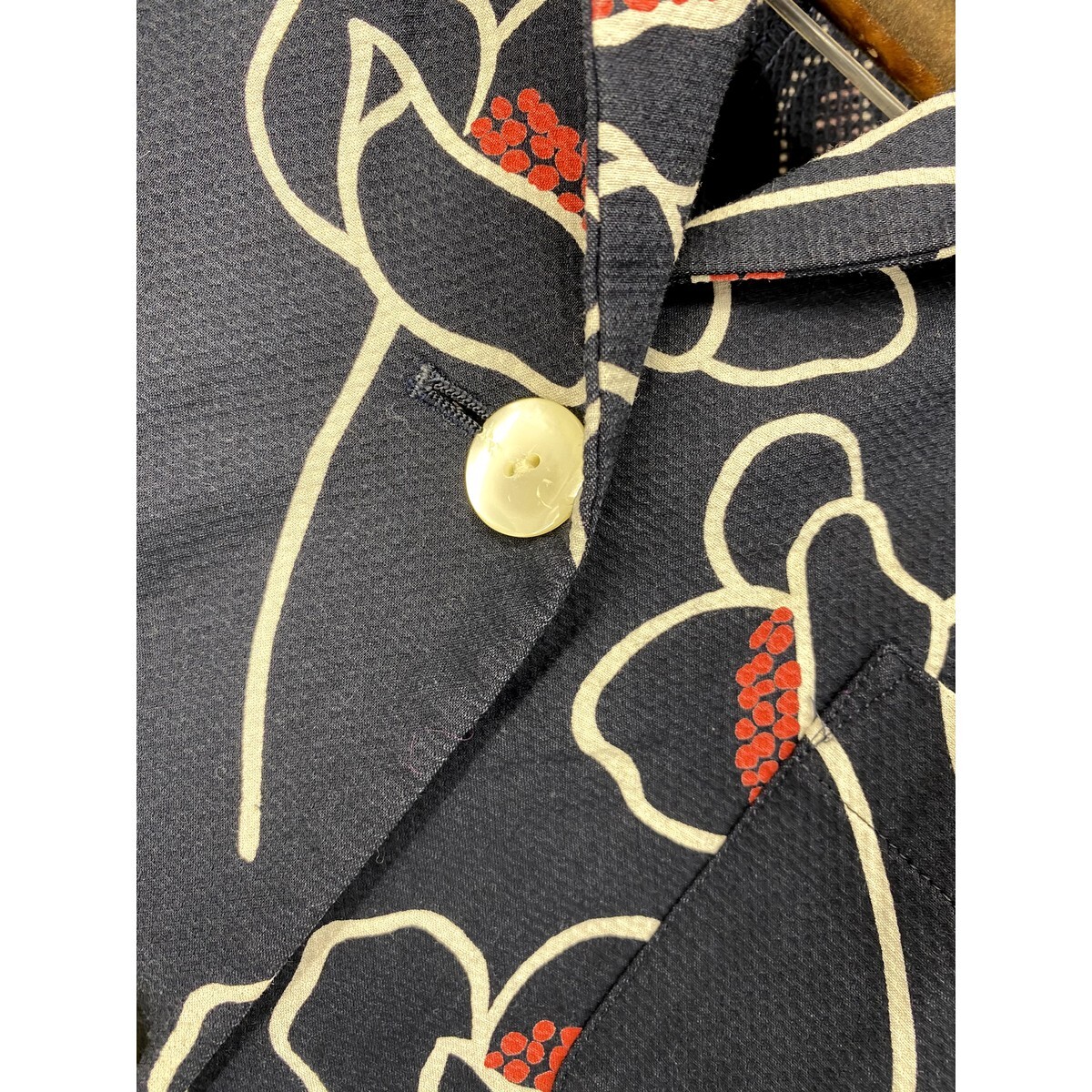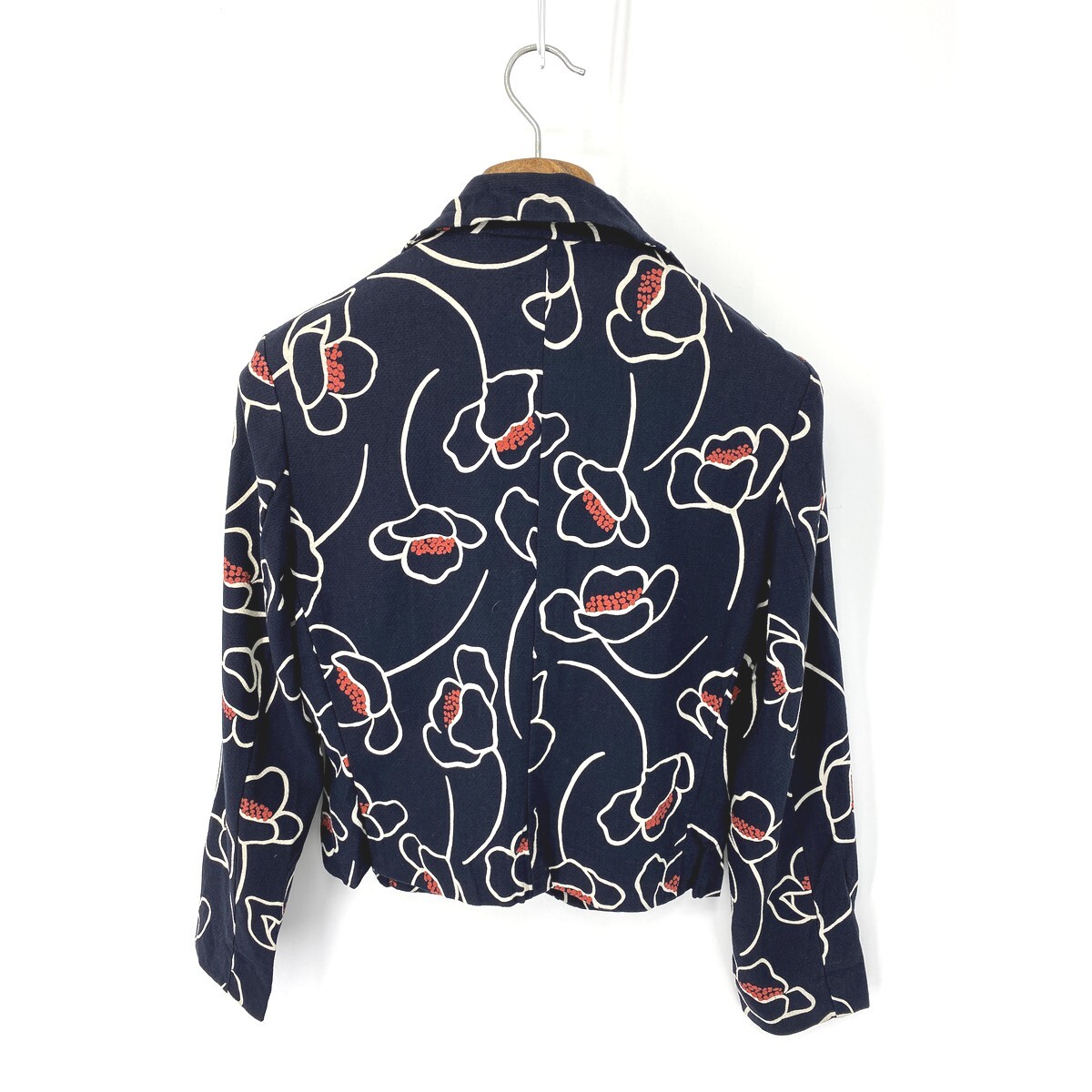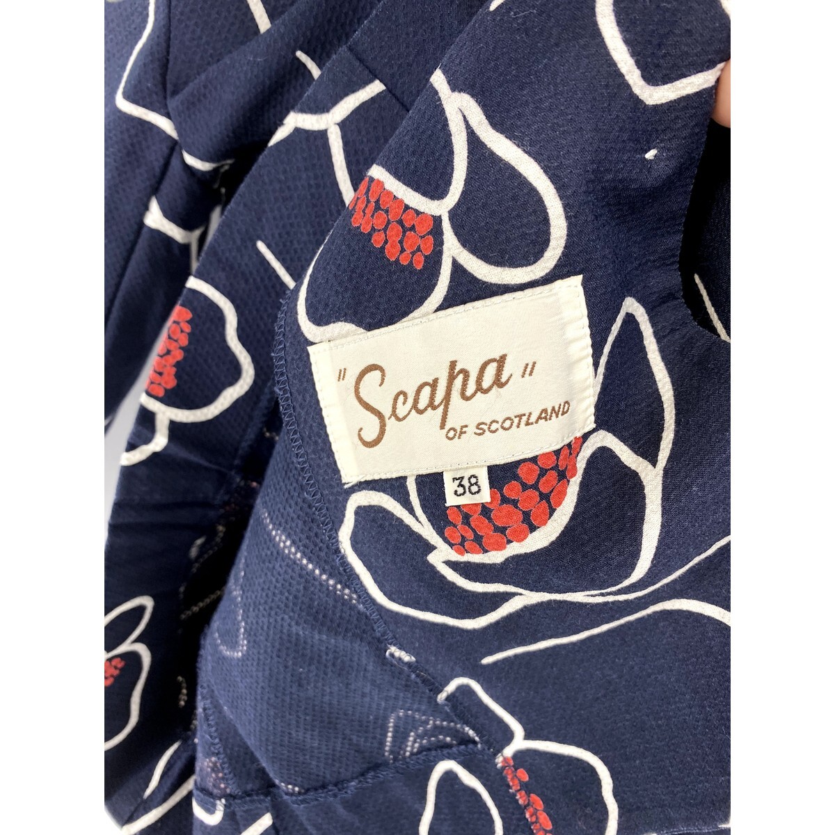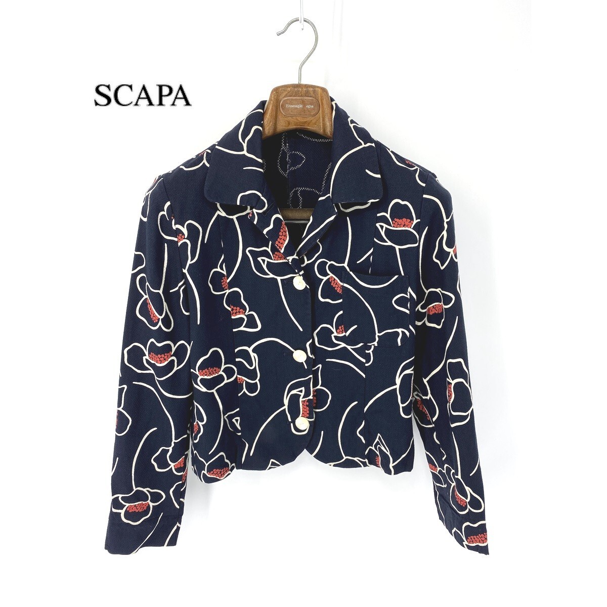 A5979/美品 春夏 裏地無し SCAPA スキャパ 花柄 総柄 おしゃれ デザイン テーラード サマージャケット 38 紺/レディース スーツ用
