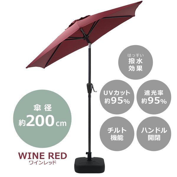 | 商品名 | 送料無料 ガーデンパラソル 直径約200cm ベースセット 撥水 UVカット 紫外線対策 日除け 日よけ 大型 チルト機能 角度調節 ハンドル開閉 紫外線対策 軽量 ベース付き 水 砂 パラソル BBQ アウトドア キャンプ 庭 カフェ parasolm706 |