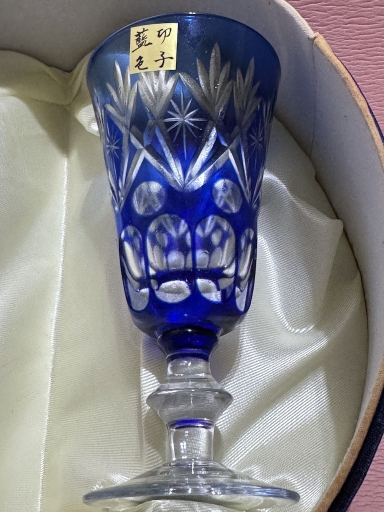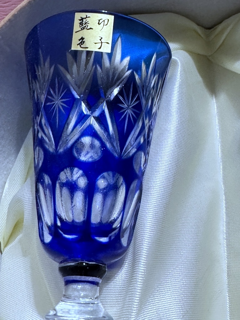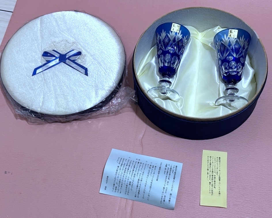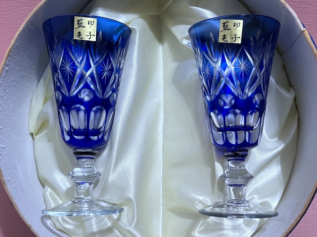 鮮やかな藍色が目を引く、美しいカット模様のワインカップ2客セットです。