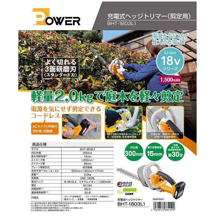 ●電池パック :B-1815LA(リチウムイオン、18V・容量1,500mAh)