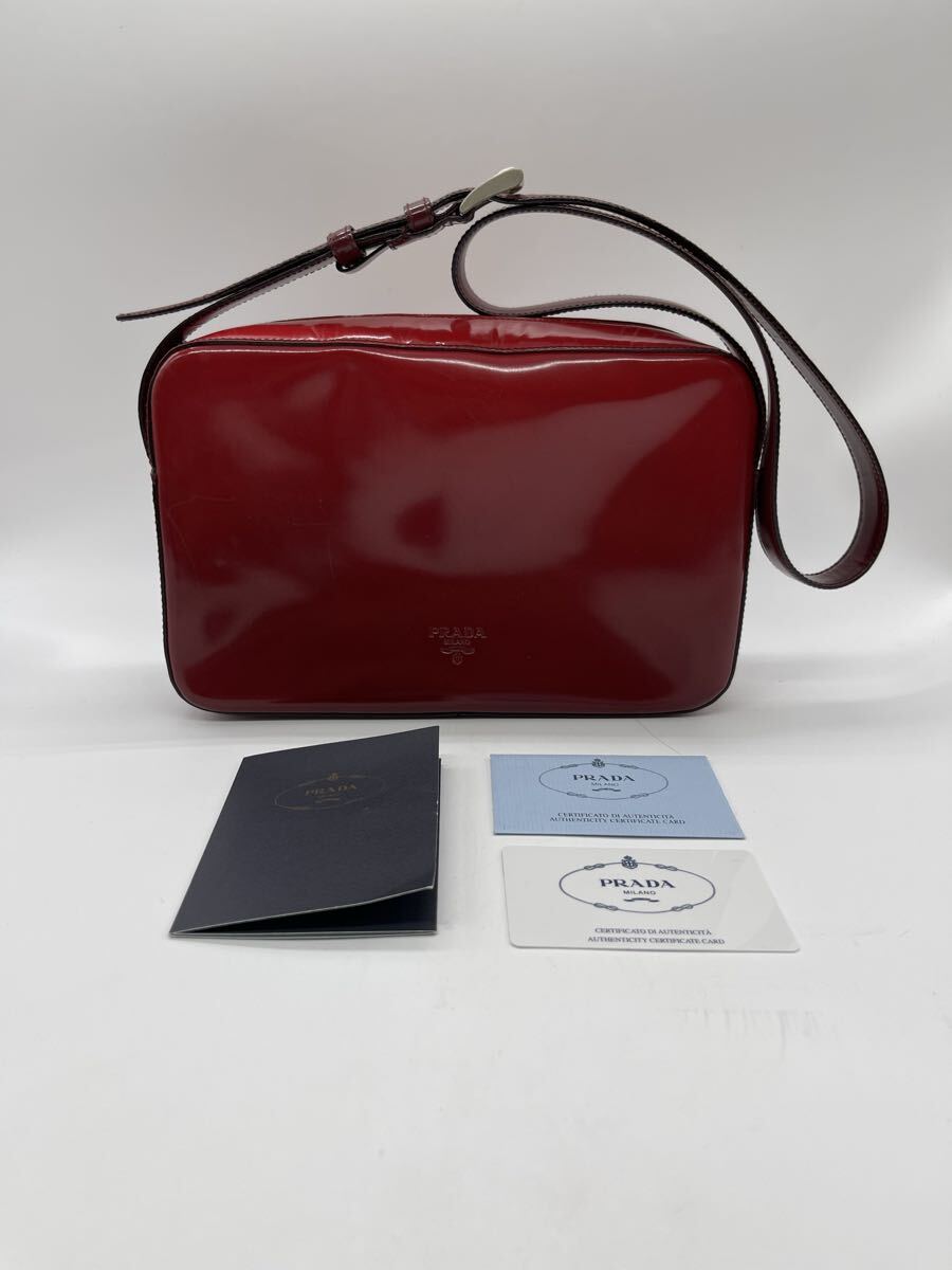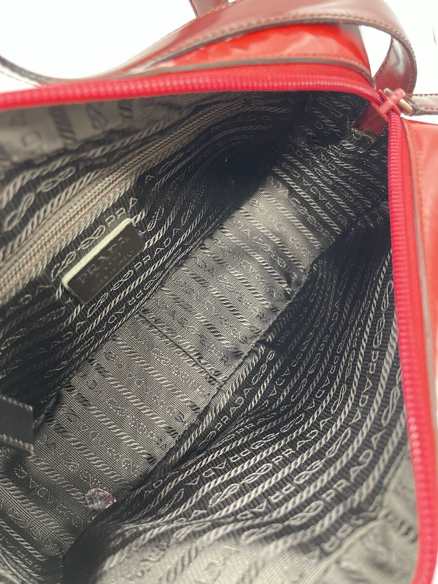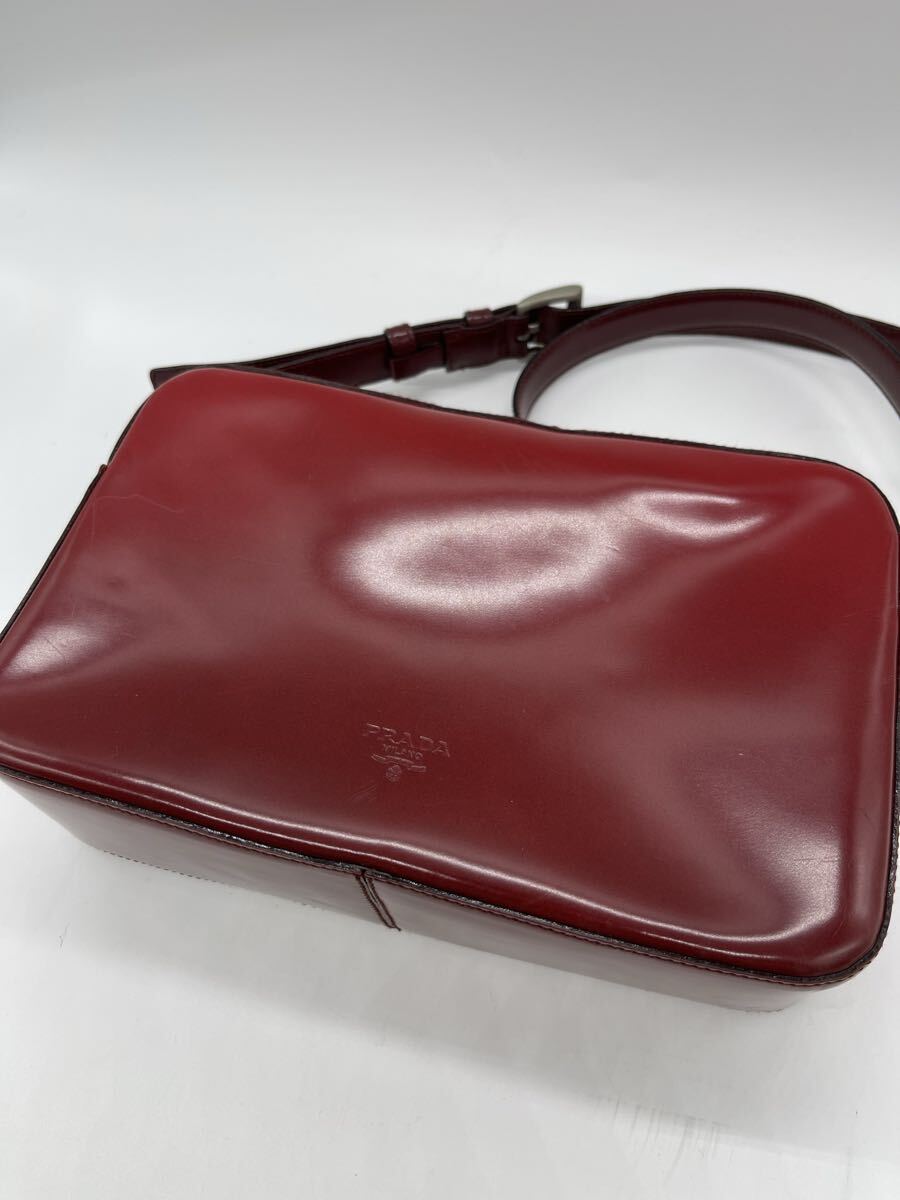 This is an elegant PRADA leather shoulder bag in a beautiful bordeaux color.