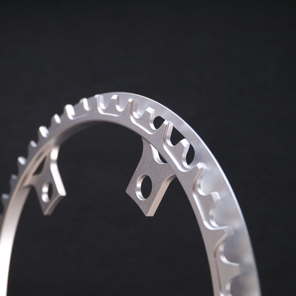 このガード付きナローワイドチェーンリングの特徴としては、チェーン落ち防止や裾の汚れ防止のほか、ガード外側がツライチの造りで歯先自体は少し内側に入るため、ダブルのクランクでアウター側に取り付けたときに、チェーンラインが適正位置に近づくというメリットがあります。