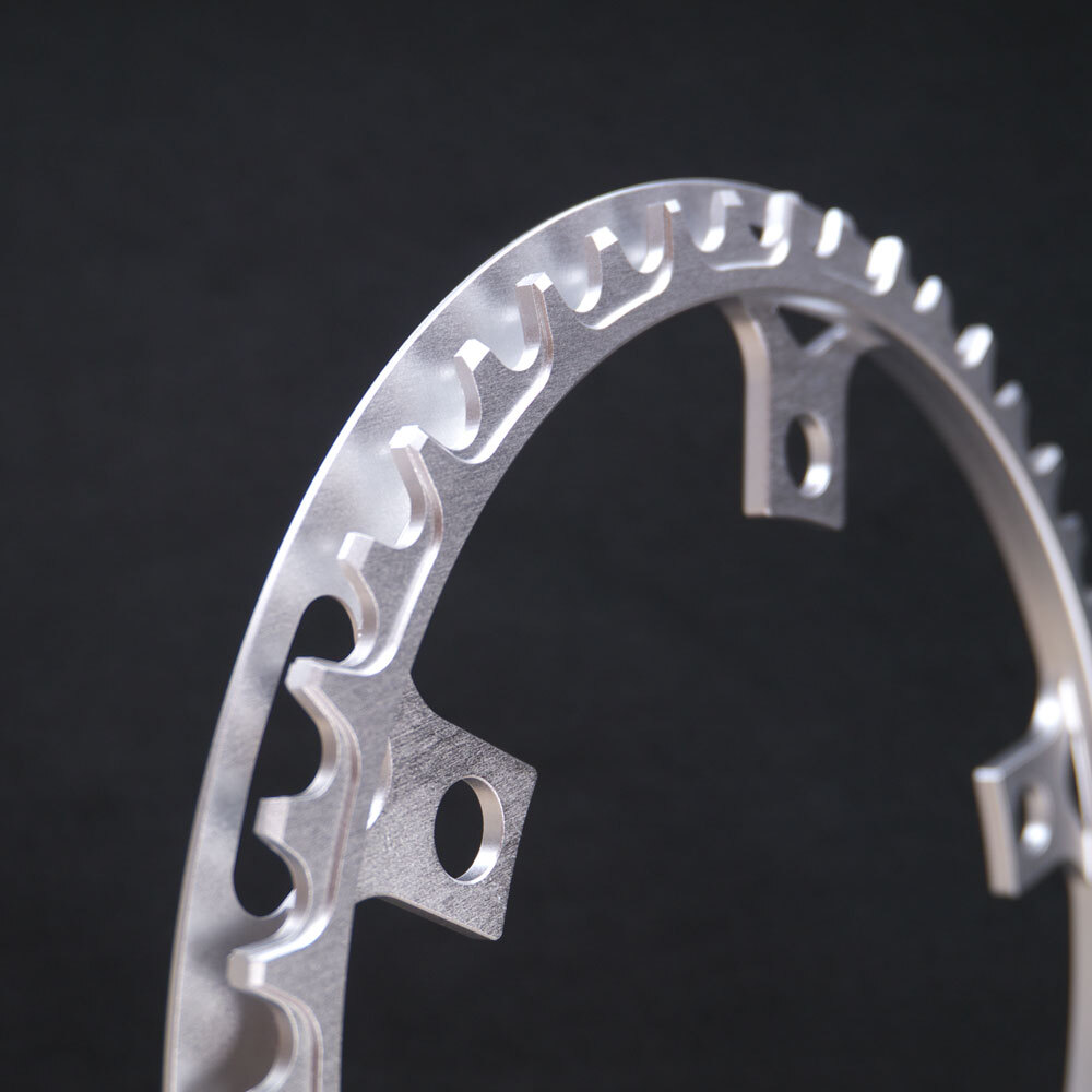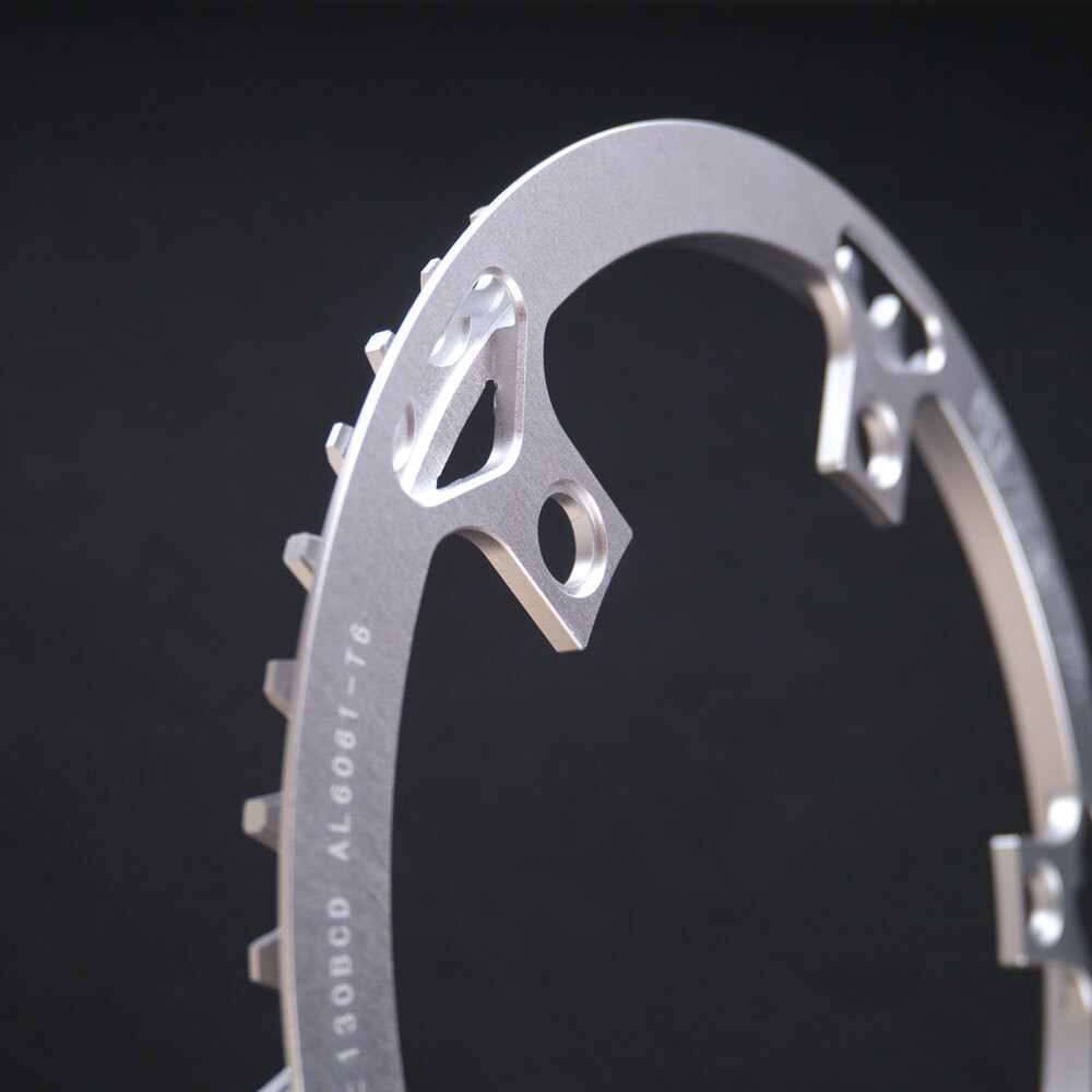 ちょっと珍しいガード一体型のナローワイドチェーンリングです。PCD130で、8速から11速まで対応します。フロントシングル専用です。