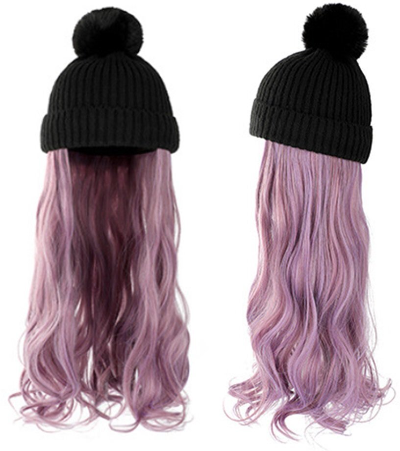 ウィッグ付きニット帽 ニット帽/ブラック ウィッグカラー/H ロングヘアー カール イメチェン 髪色チェンジ コスプレ n467