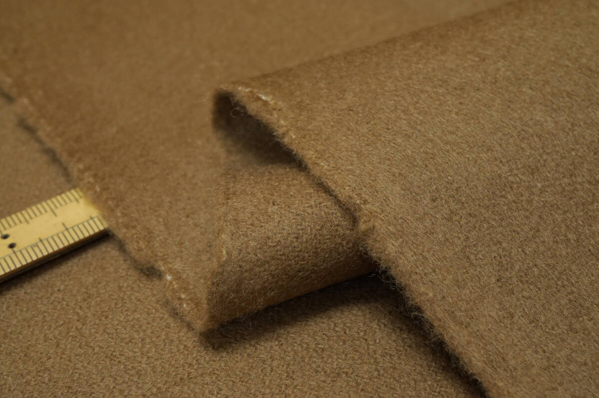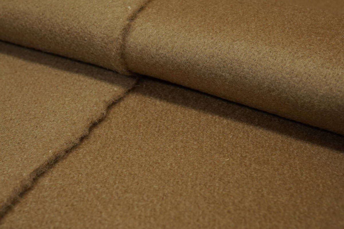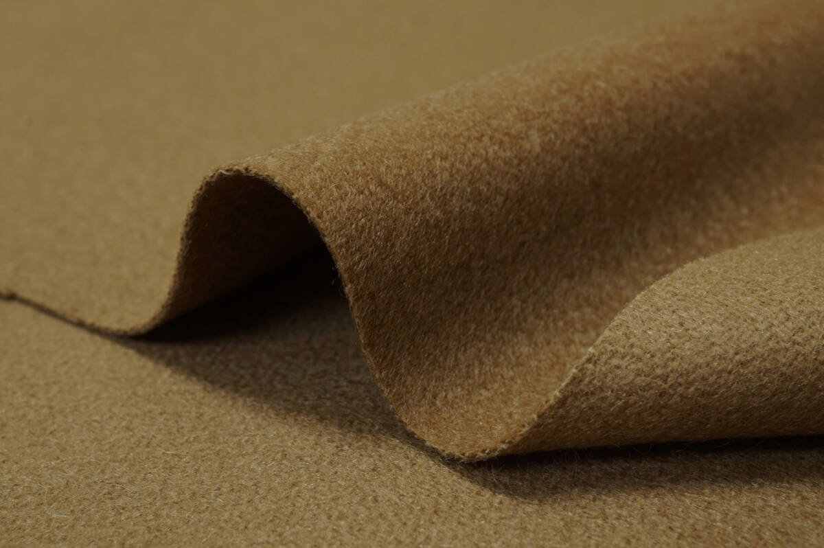 カシミヤ100%、微厚、ソフト系、控えめな光沢感、滑り、毛並方向、色調:渋めのキャメル系で、硬質感や重量感などはございません。