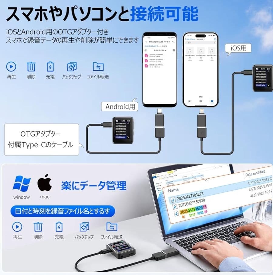 ♪ OTG機能に対応し、Android/iOS/Windows/Macとの互換性を実現。スマートフォンやパソコンに接続するだけで、データ管理や音声再生・削除などの操作が簡単に行えます(iOS/Android用アダプターを同梱しているため、開封後すぐにご利用いただけます。)。