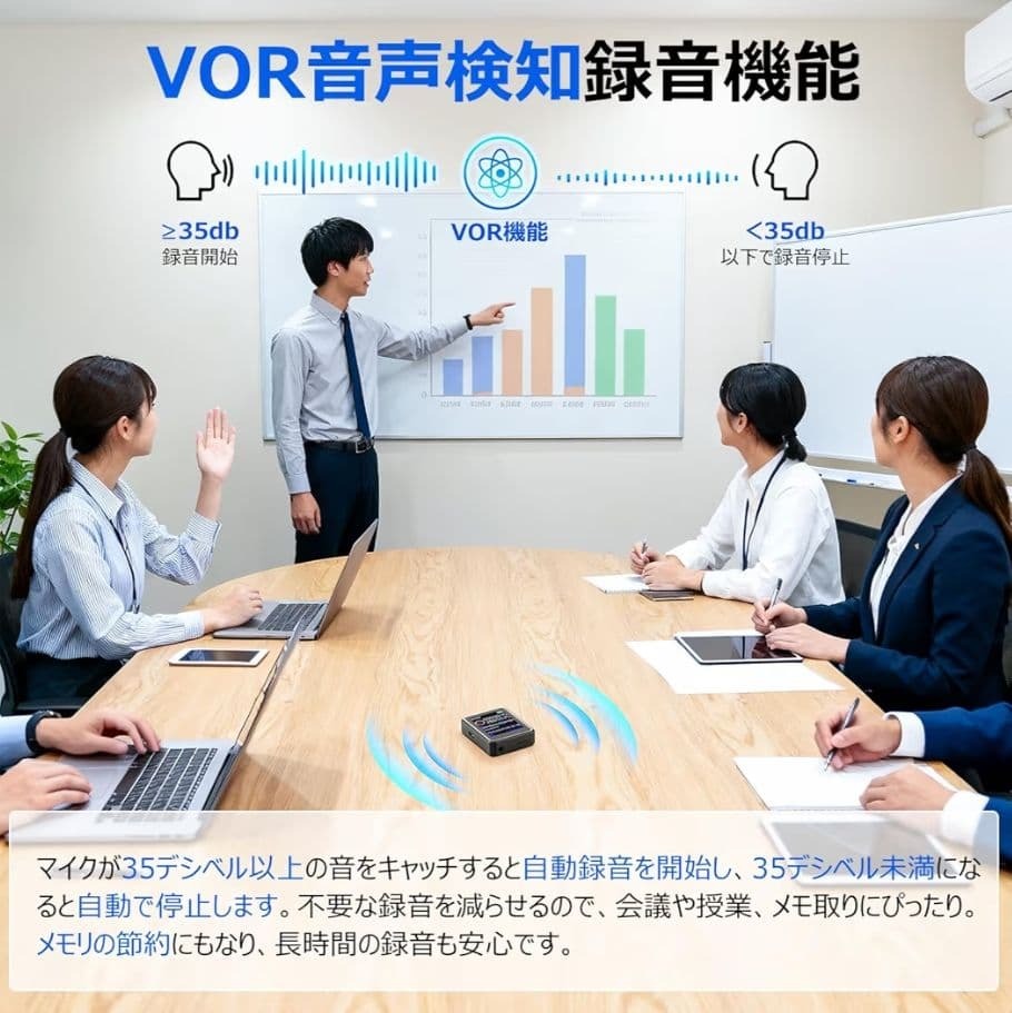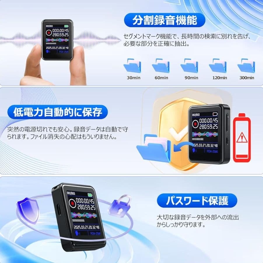 ♪ 「音ありで録音開始、音なしで録音停止」を実現します。この機能により無音部分を自動的にフィルタリングし、保存容量を大幅に節約。さらに、30分から300分まで自由に設定できる柔軟な分割録音機能を搭載しています。