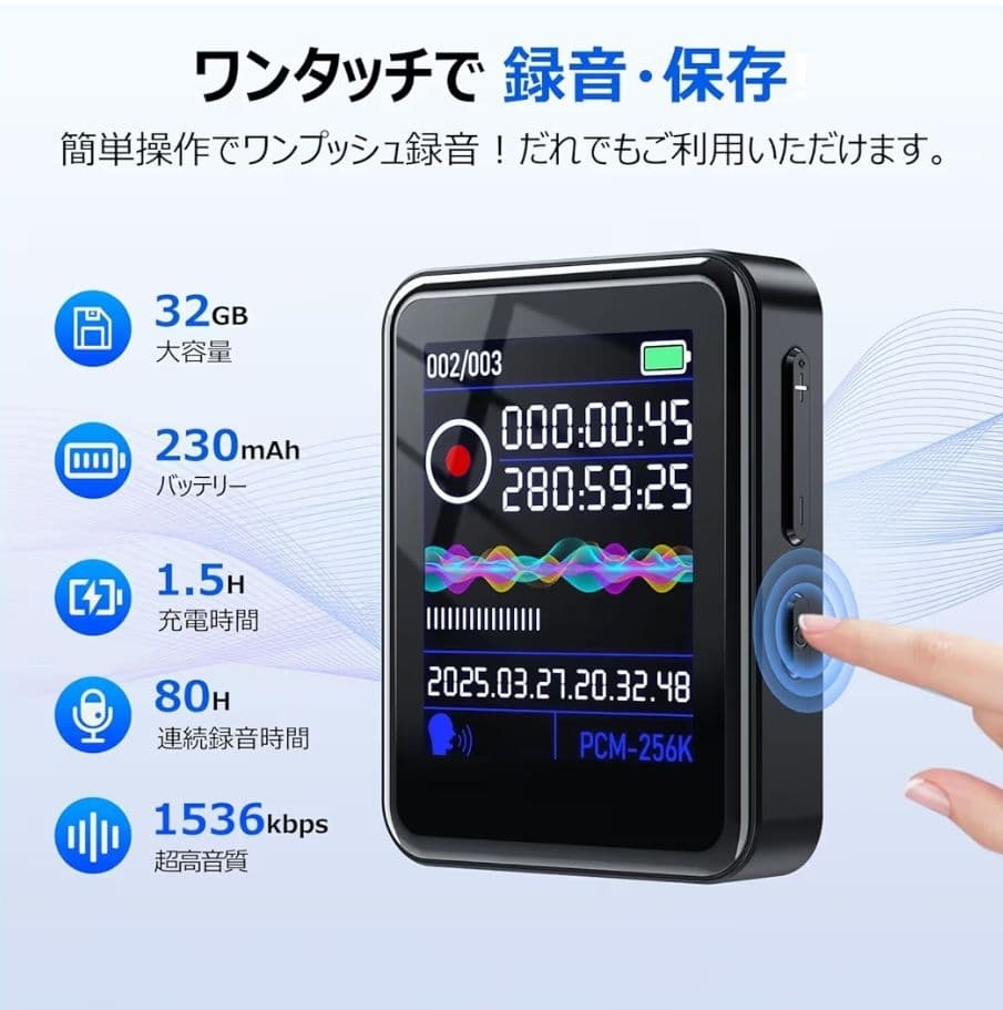♪ 内蔵32GBメモリにより、約80時間の連続録音を実現し、長時間の録音が途中で止まるご不安は無用です。Type-C急速充電に対応し、わずか1.5時間の充電で長時間の使用が可能です。
