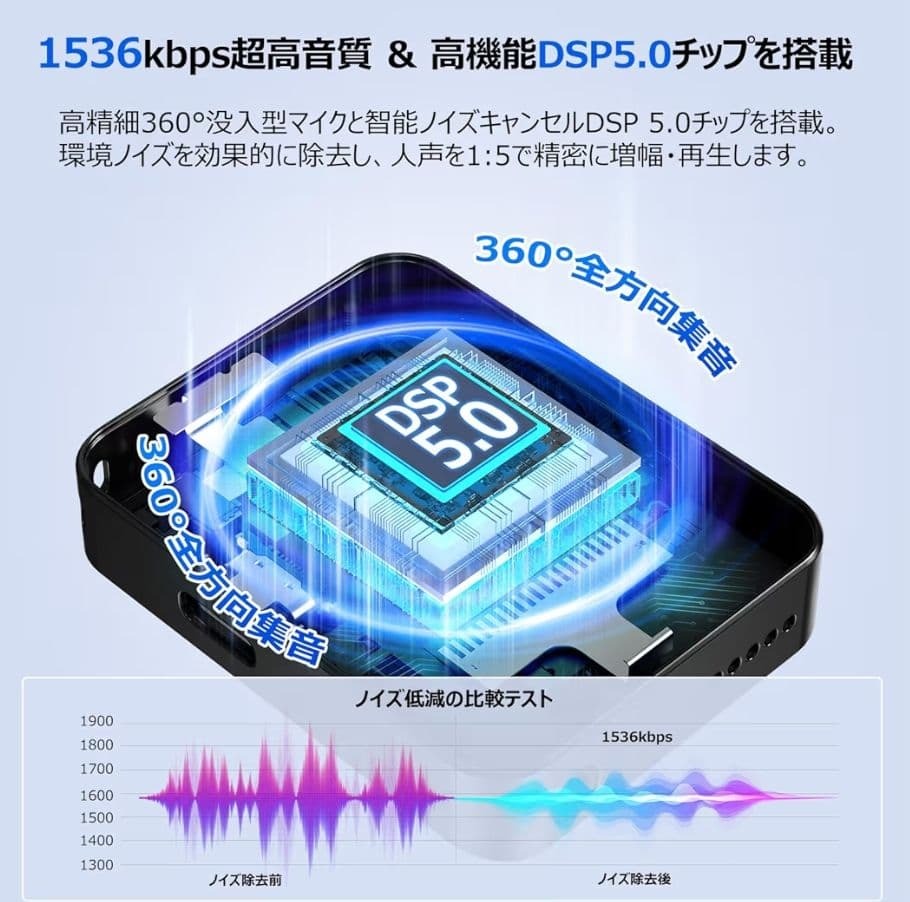 ♪ 高感度360°全方向マイクと業界先進のDSP5.0ノイズキャンセリングチップを内蔵し、雑音環境下でも音声を正確に捕捉し、背景騒音を自動的に濾過することで、クリアで純粋な音声録音を実現します。