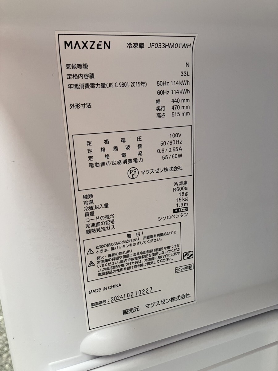 中古】大阪引取限定 マクスゼン 冷凍庫 JF033HMO1WH 33リットル