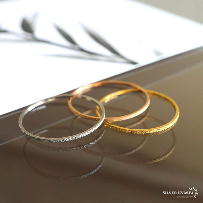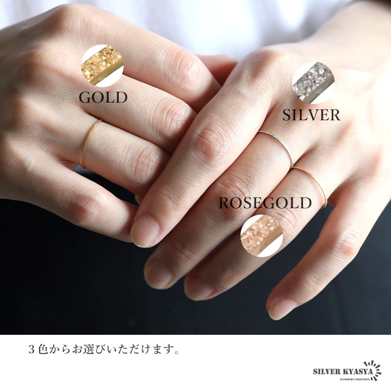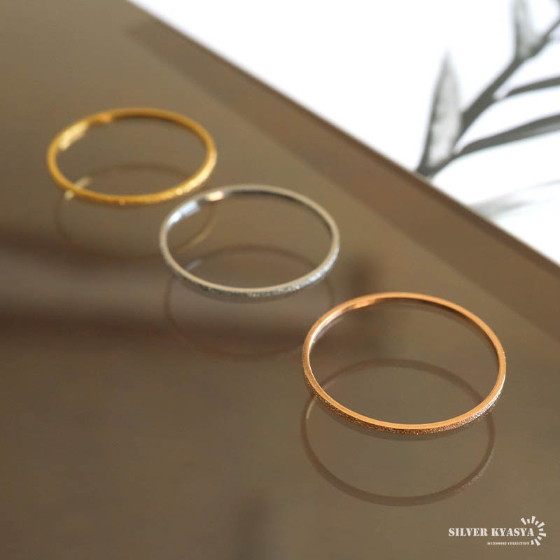 幅0.5mmの超極細のリング。表面には星屑のような輝きを放つ砂目デザインを施しております。太めのリングとの重ね付けや、他のリングと合わせたり幅広く活躍してくれます。カラーはゴールド/シルバー/ローズゴールドの3色からお選びいただけます。