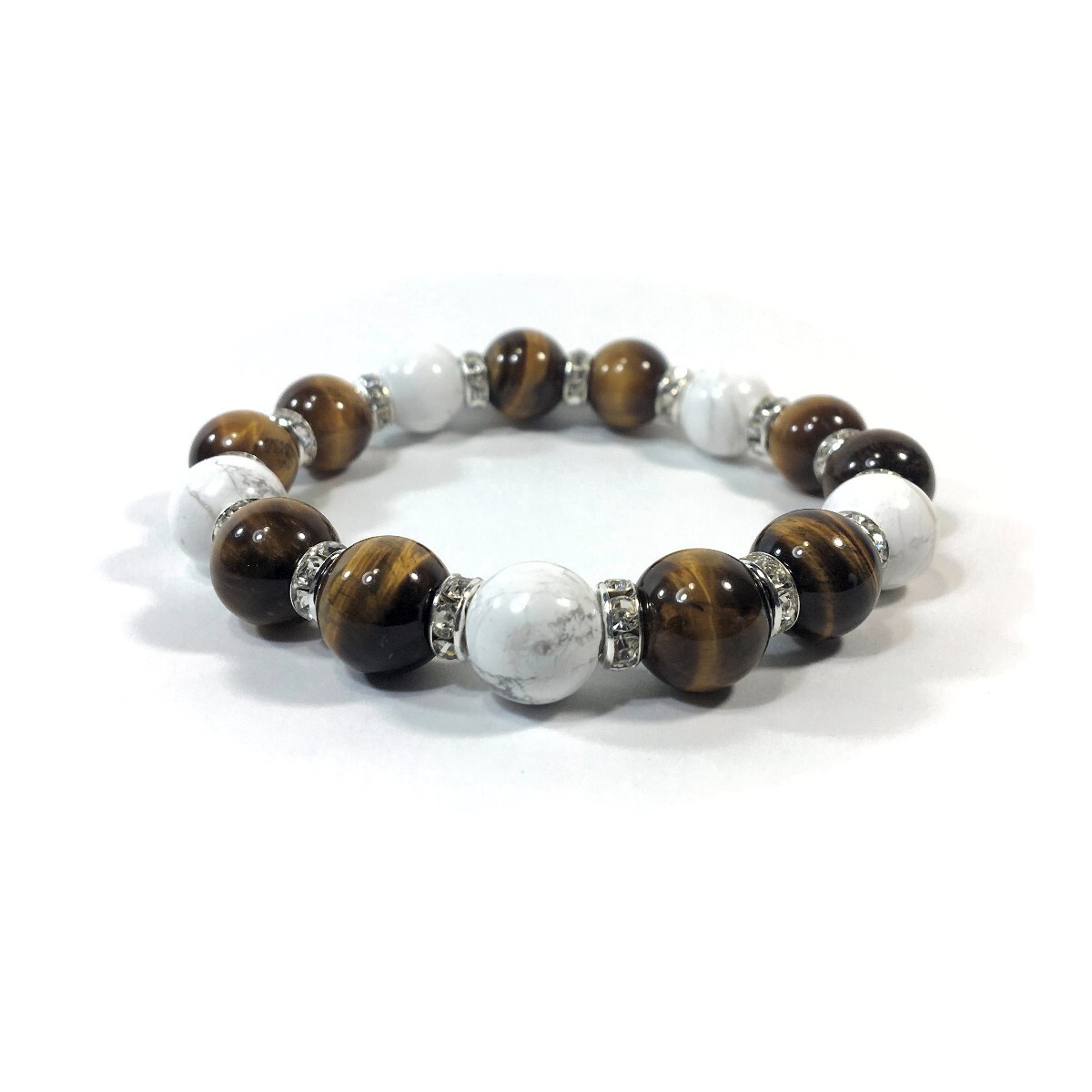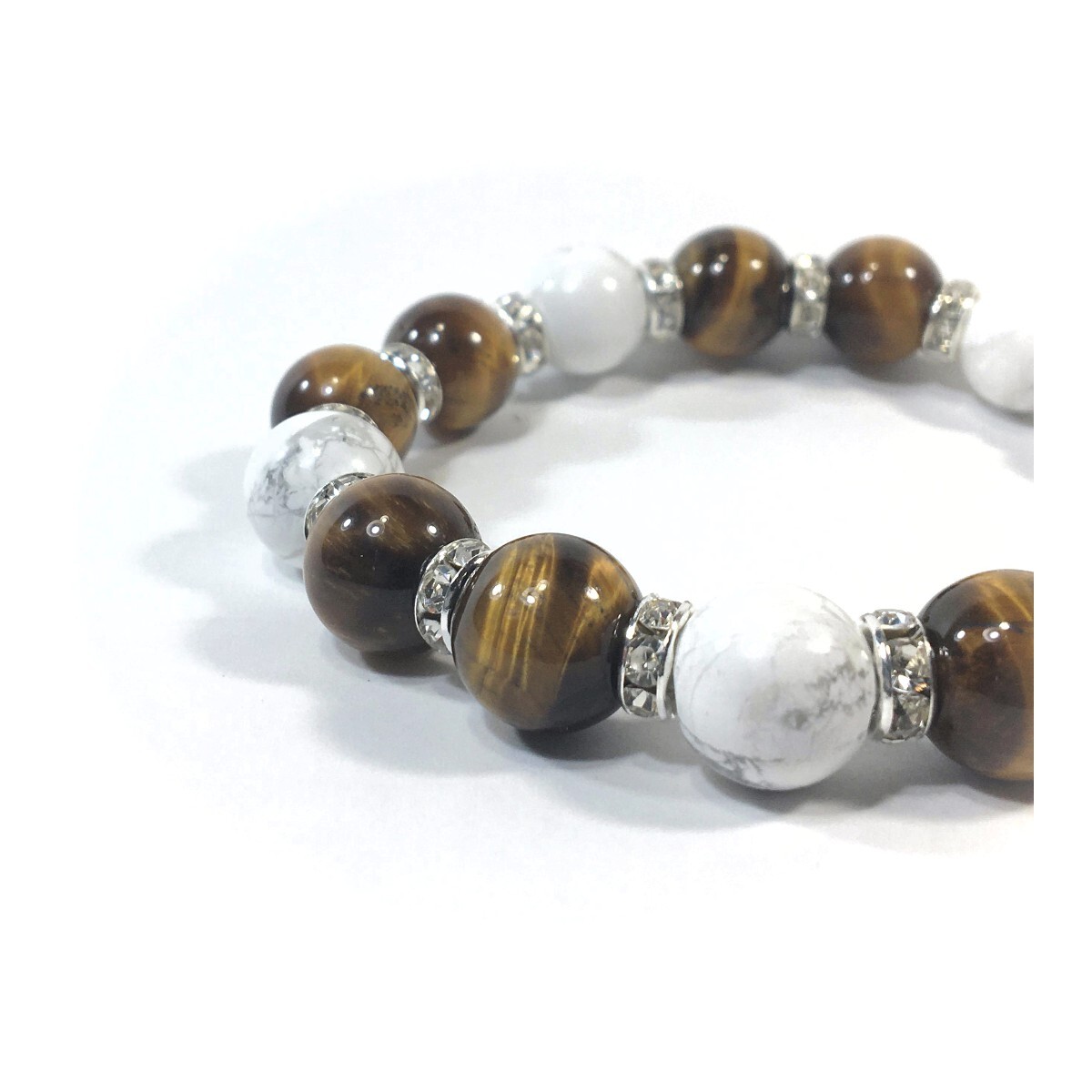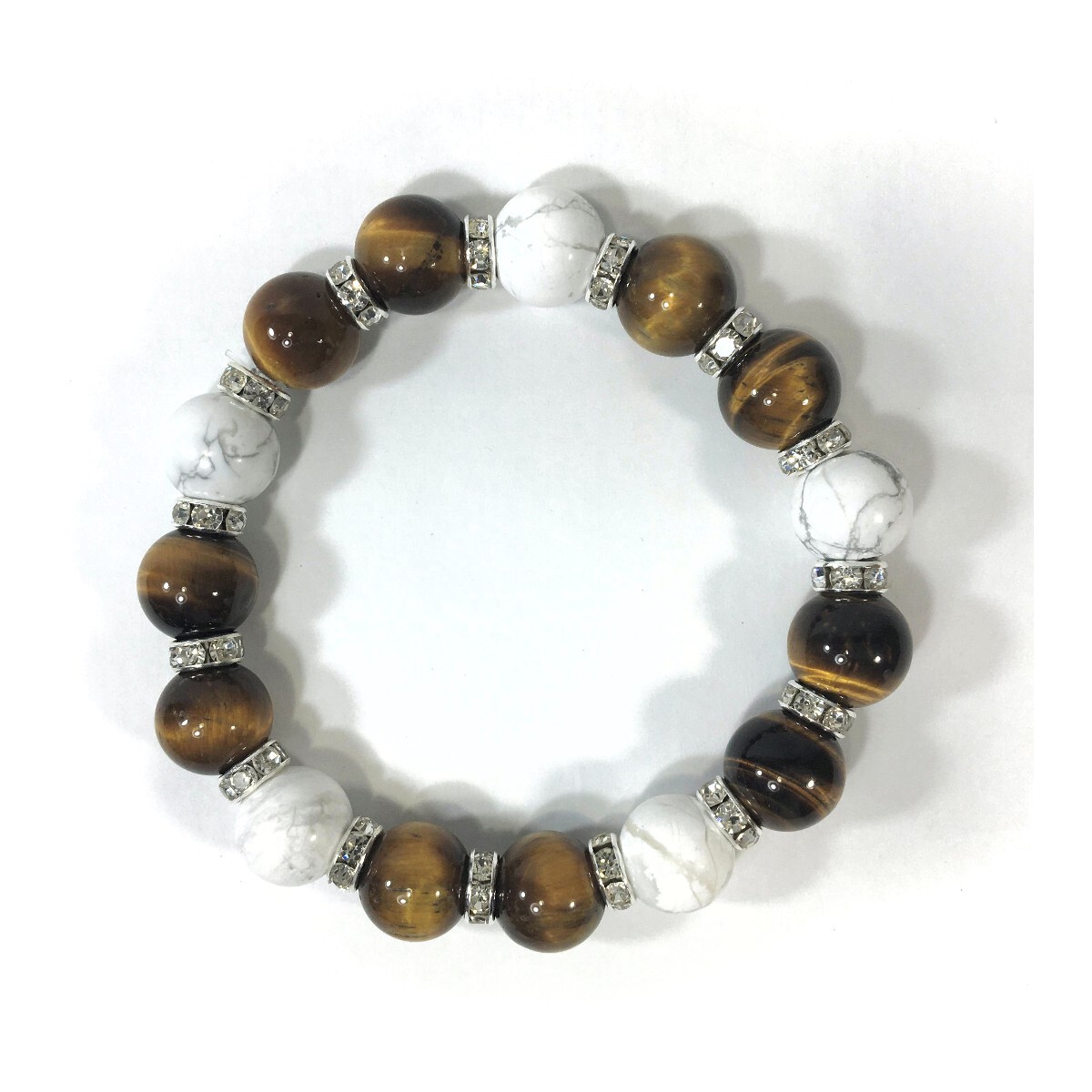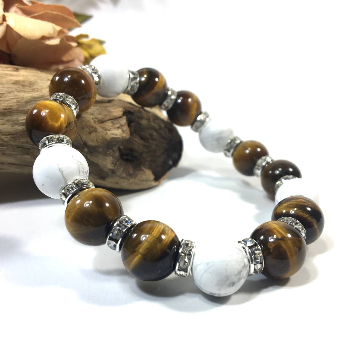 こちらは、タイガーアイとハウライトを組み合わせたパワーストーンブレスレットです。間にはロンデルを挟み高級感あるデザインに仕上げております。石大きさは12mm玉を使用して内径約18cmです。気になる方は是非この機会にどうぞ。