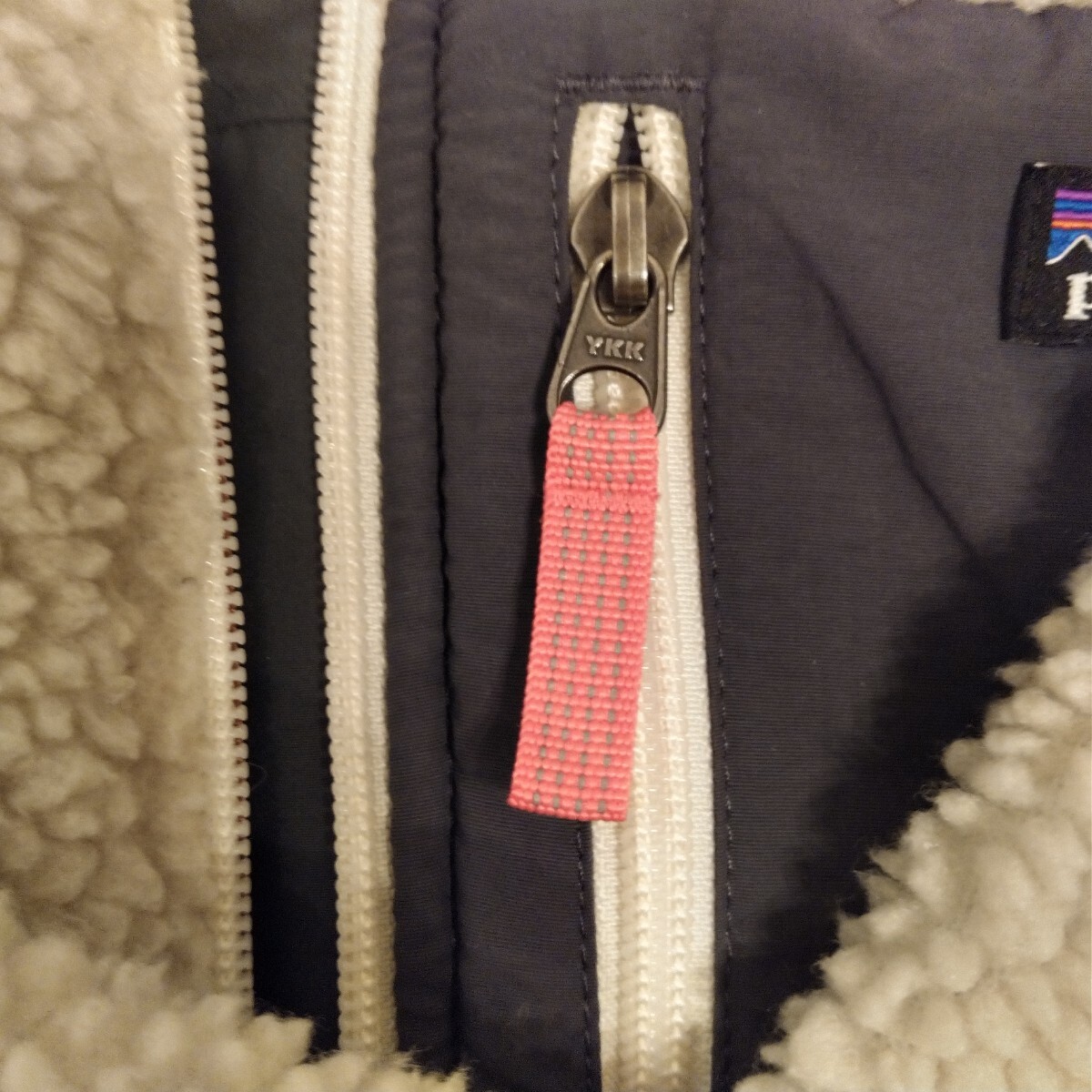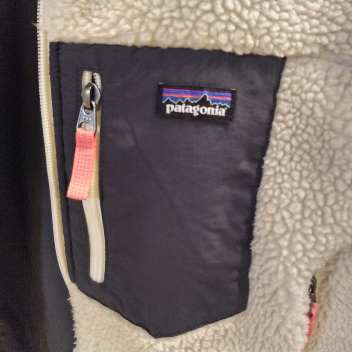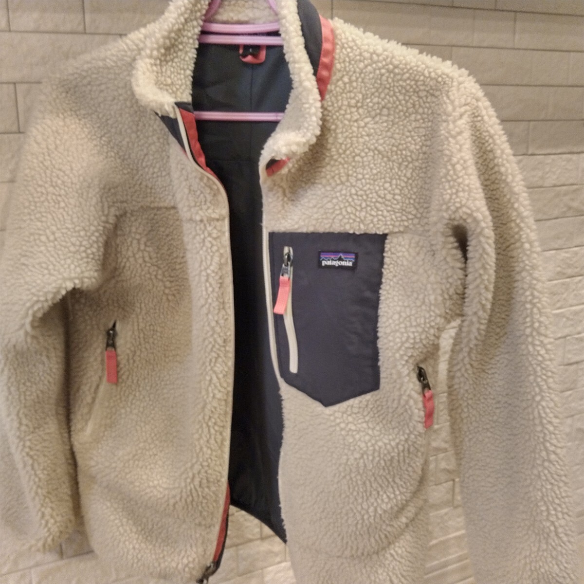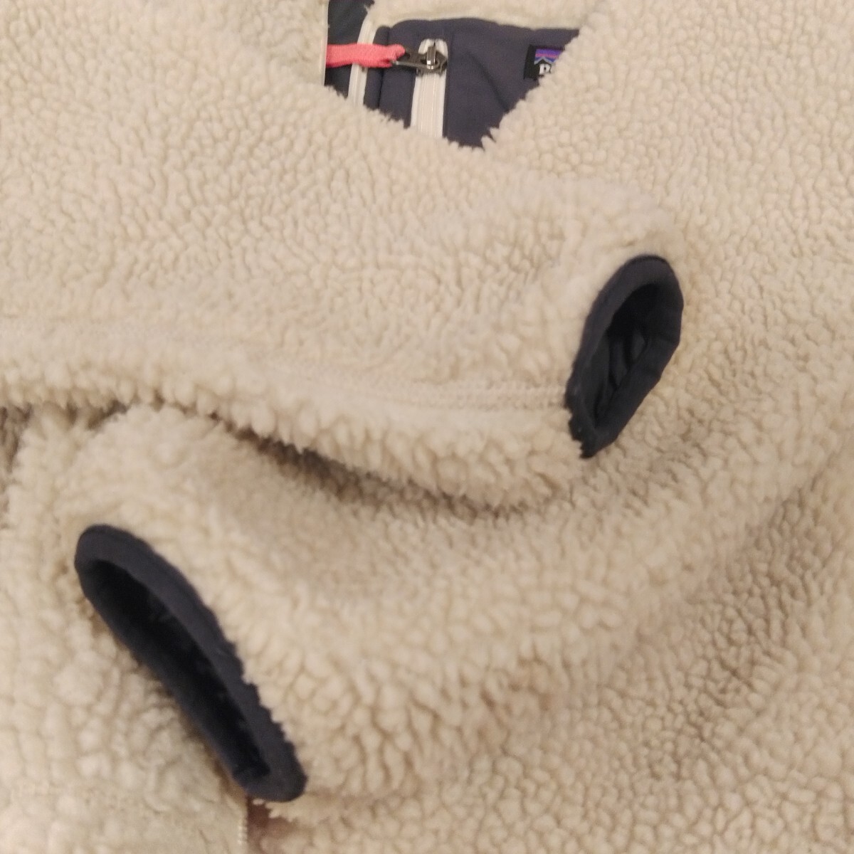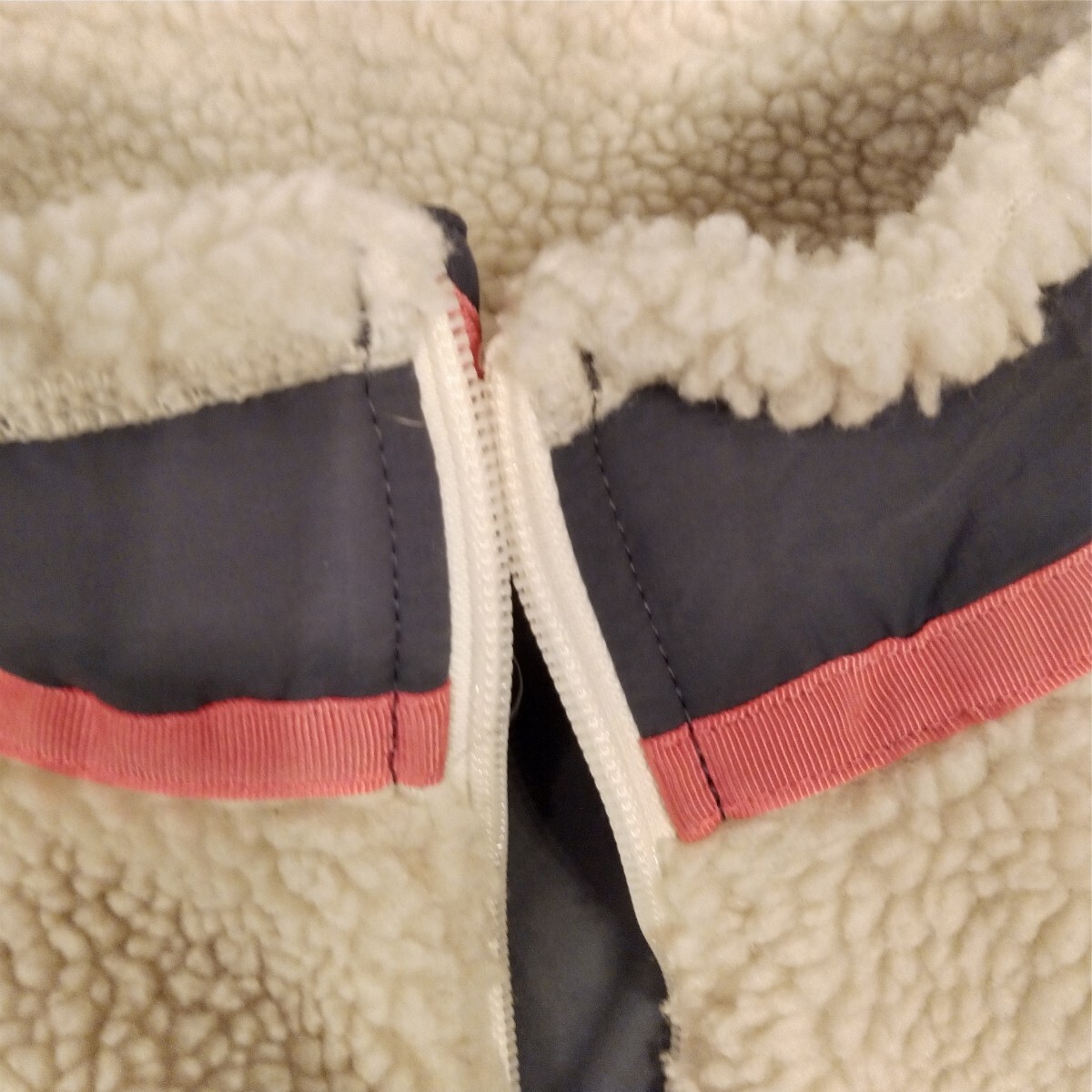 フリース素材のベージュとネイビーのジャケット、ジッパーポケット付き。
