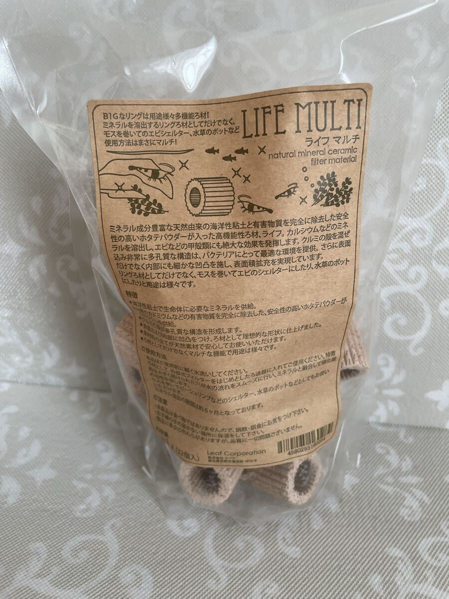 ライフマルチはミネラルを溶出する大きめのリングろ材で天然由来の海洋性粘土と有害物質を完全に除去した安全性の高いホタテパウダーが入った高機能ろ材でエビなどの甲殻類にも絶大な効果があります。多孔質な構造でバクテリアにとって最適な環境を提供します。