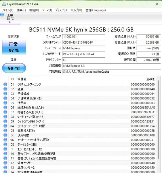 ・SSD:NVMe PCI-E 4.0 256GB BC511 NVMe SK hynix 256GB