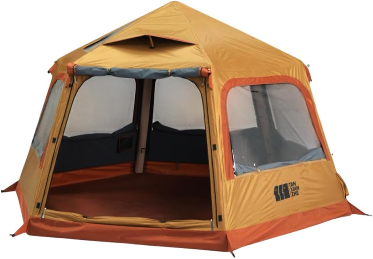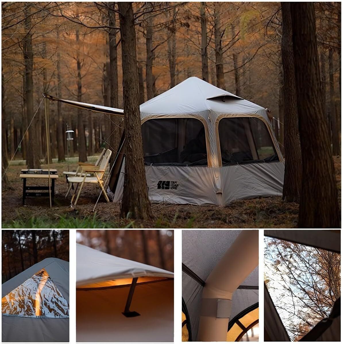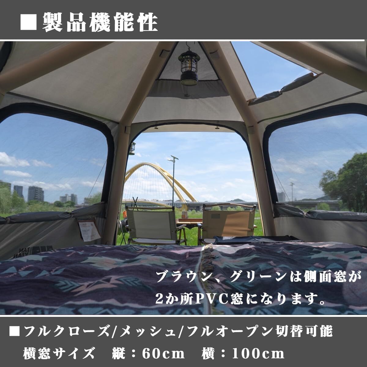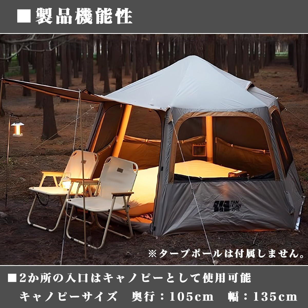 【製品用途】六角形のおしゃれなデザインで空間を広く使用できます。テント側面部の天井も130cmとテント内の空間を隅々まで使用しやすい居住性の高い構造。テント入り口を含めたそれぞれの面にはメッシュ窓を設けているので季節に合わせて、クローズ、フルメッシュで快適なキャンプが楽しめます。