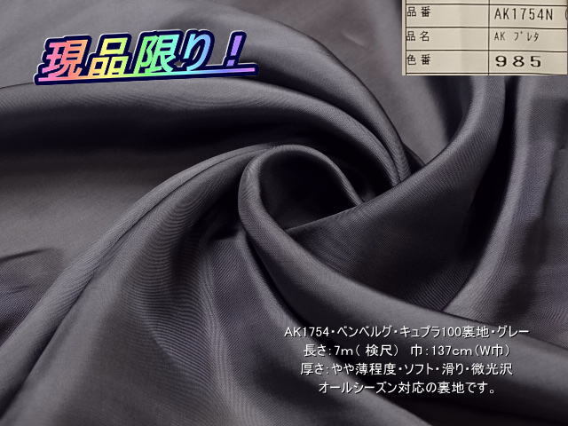 商品は、AK1754・ベンベルグ・キュプラ100裏地・グレーでございます。