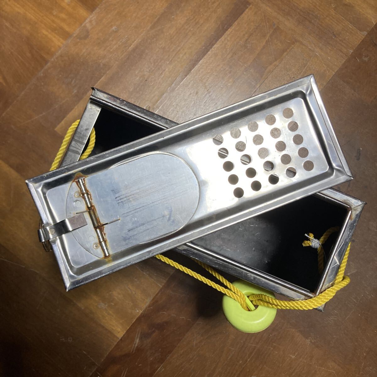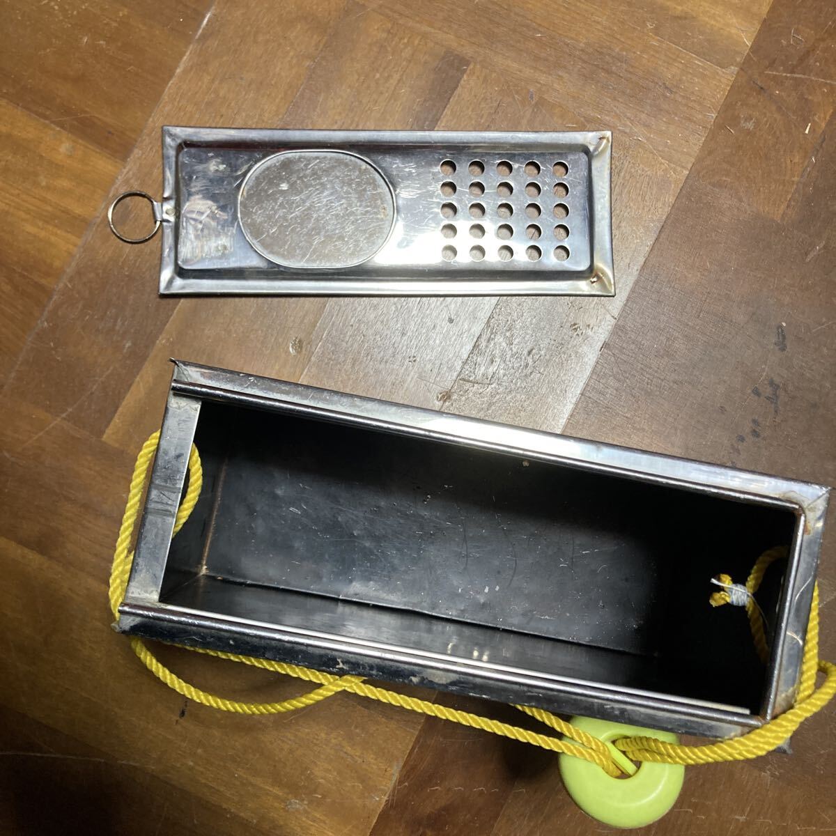 魚入れです。全体的に使用感ありでボコボコですが普通に使えると思います。名前をマジックで書いてあります。クリーニングはしないで発送します。ノークレームノーリターンで。送料着払いになります。