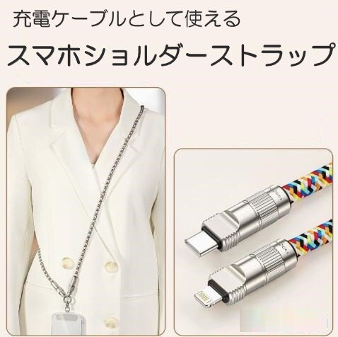 スマホショルダーストラップ マルチカラー 120cm 充電ケーブル 2in1 TypeC + Lightning 充電コード 斜めがけ 肩掛け