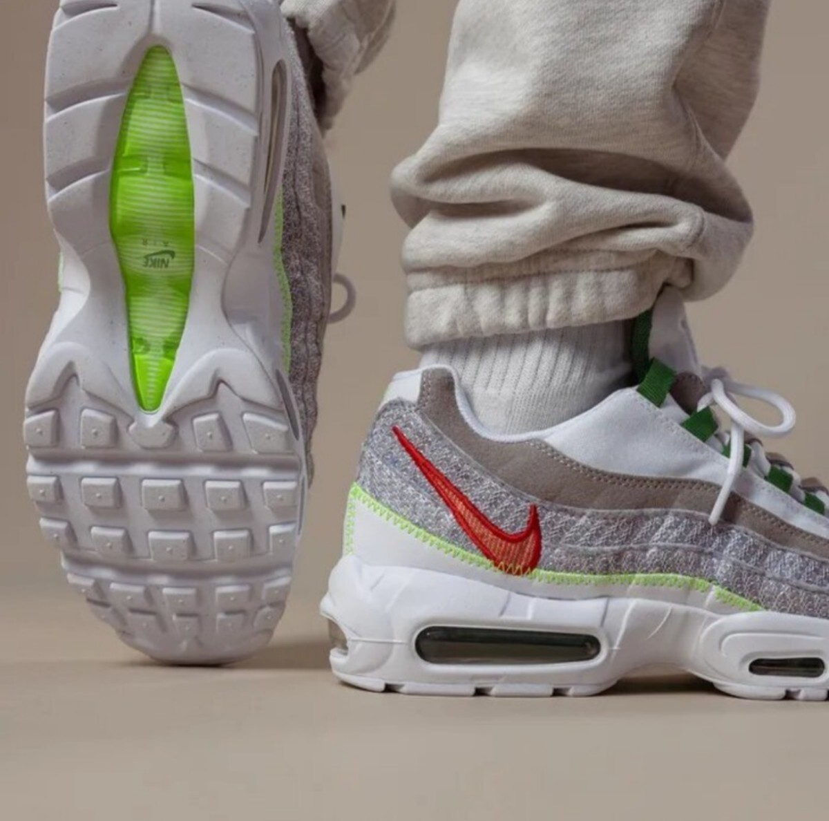 AIRMAX95では雪のようなホワイトを基調に、アイコニックなボーダーパネルをリサイクルキャンバスやフェルトで切り替え温かみのある装いへ。