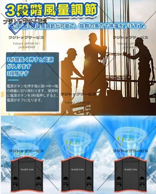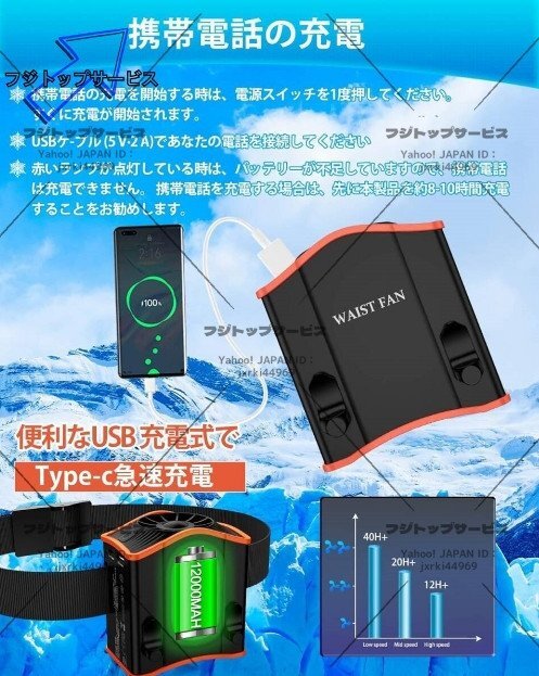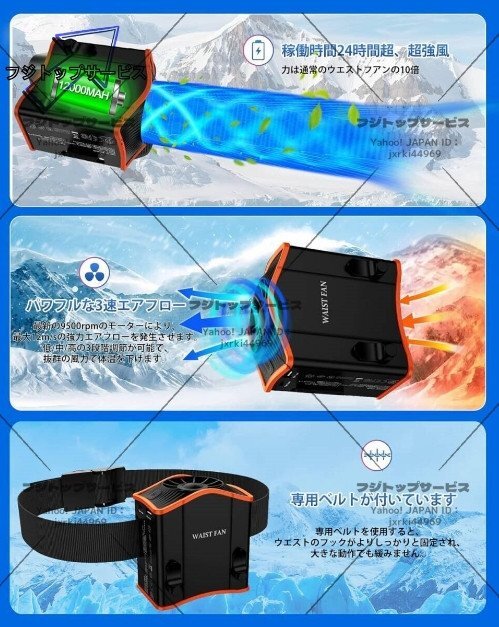 12000mAh腰掛け扇風機 携帯扇風機 最大24時間稼働、3段階調節 多機能携帯式腰掛け扇風機ハンズフリーベルトファン 屋外作業 熱中症対策