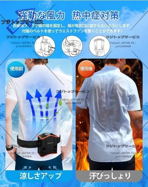 【多機能ウエストファン】多機能なポータブルUSB扇風機です。多機能携帯式腰掛け扇風機付き、専用ベルトが付属しています。このウエストファンは野外作業やアウトドアの必需品になります。