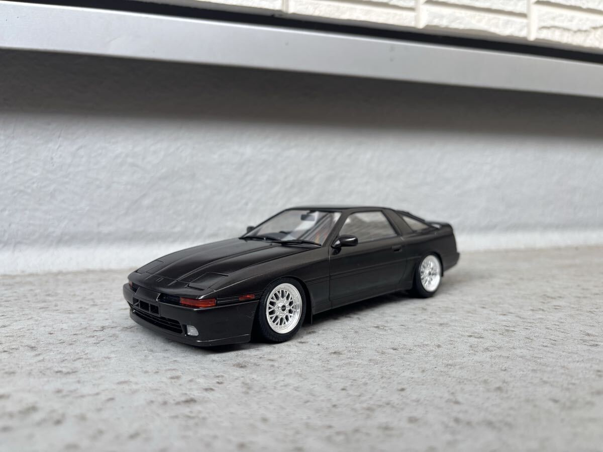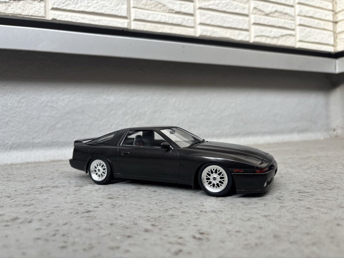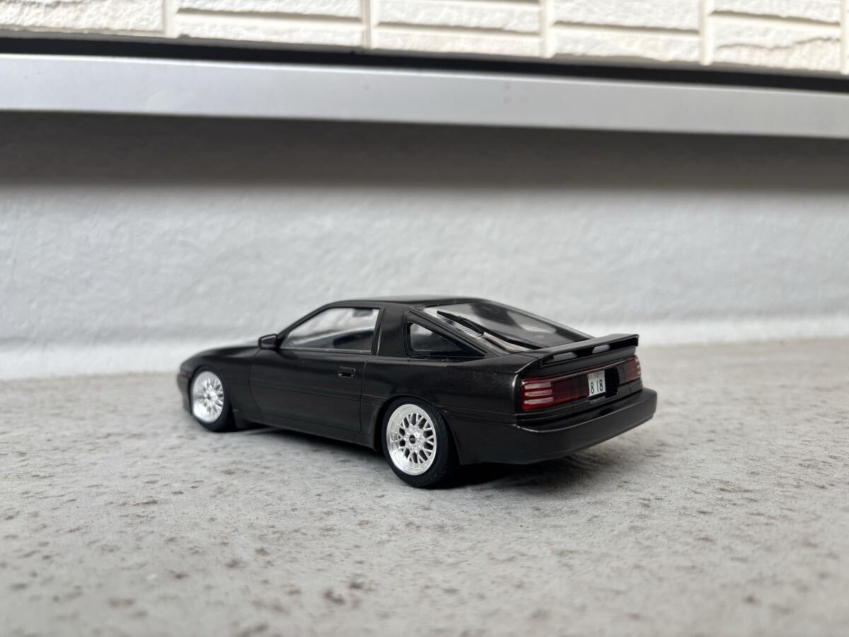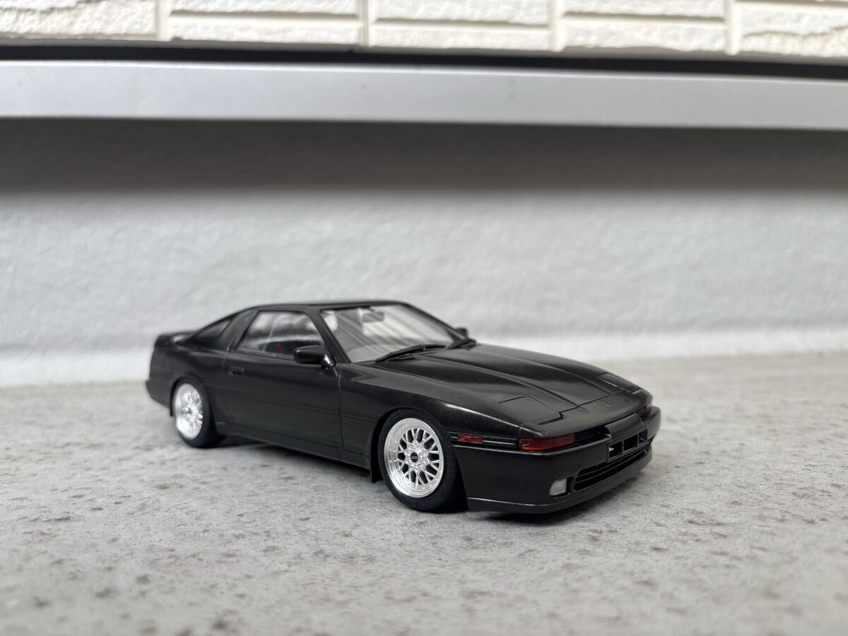 ハセガワ製、トヨタ、スープラ ターボ A70 JTC車両ベース公道仕様の完成品です。ボディカラーはメタリックブラックです。クリヤー吹き付け後に実車用ワックスにて仕上げています。 JTC車両ベースですので内装はドンガラです。自作にて車高を落としている為、多少の舵取りは可能ですが回転不可です。ホイールはアオシマ製、BBS RSIIに変更しています。付属のサイド出しマフラーは車高が低い為、取り付けていませんので同封します。素人作品の為、完璧ではありませんのでノークレーム・ノーリターンでお願いします。発送はゆうパック着払いのみとさせていただきます。また、発送中に部品等が外れてしまった場合は恐れ入りますが落札者様にて修理をお願いします。支払いはかんたん決済のみとさせて頂きます。尚、評価の悪い方、新規の方はいたずら入札防止の為、削除させて頂きます。 完成品を多数出品していますので是非そちらもご覧ください。