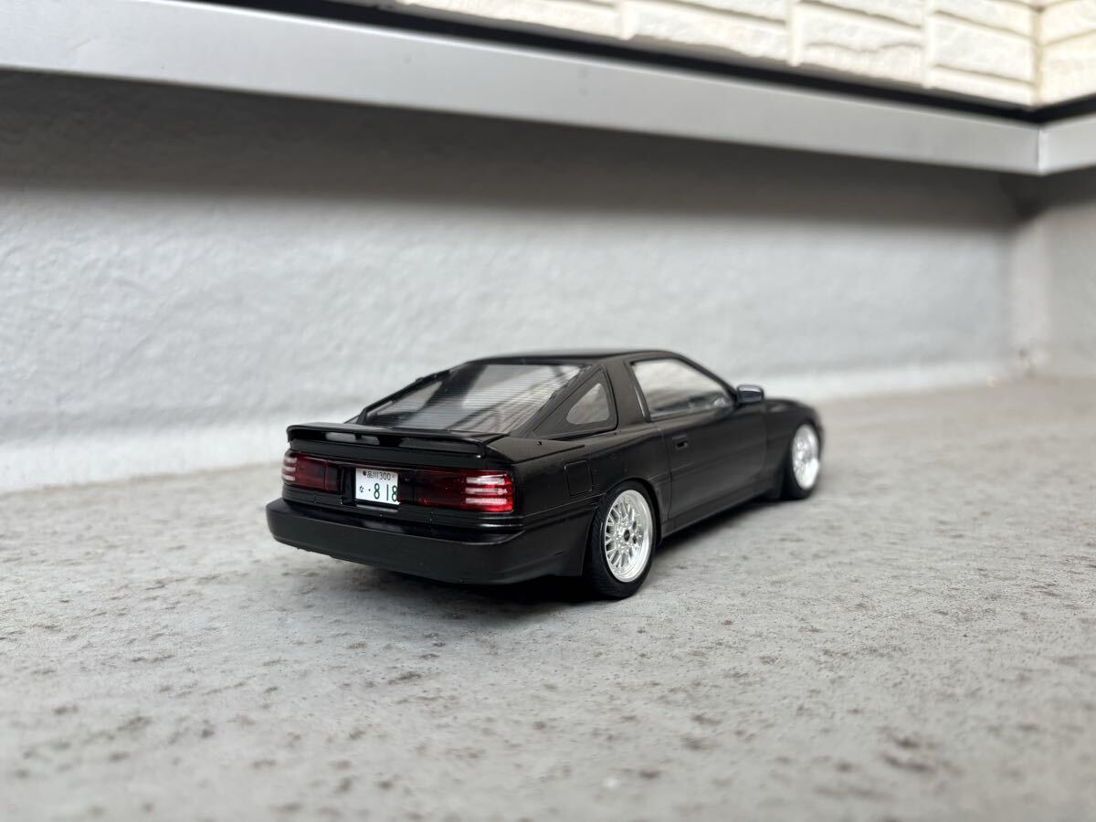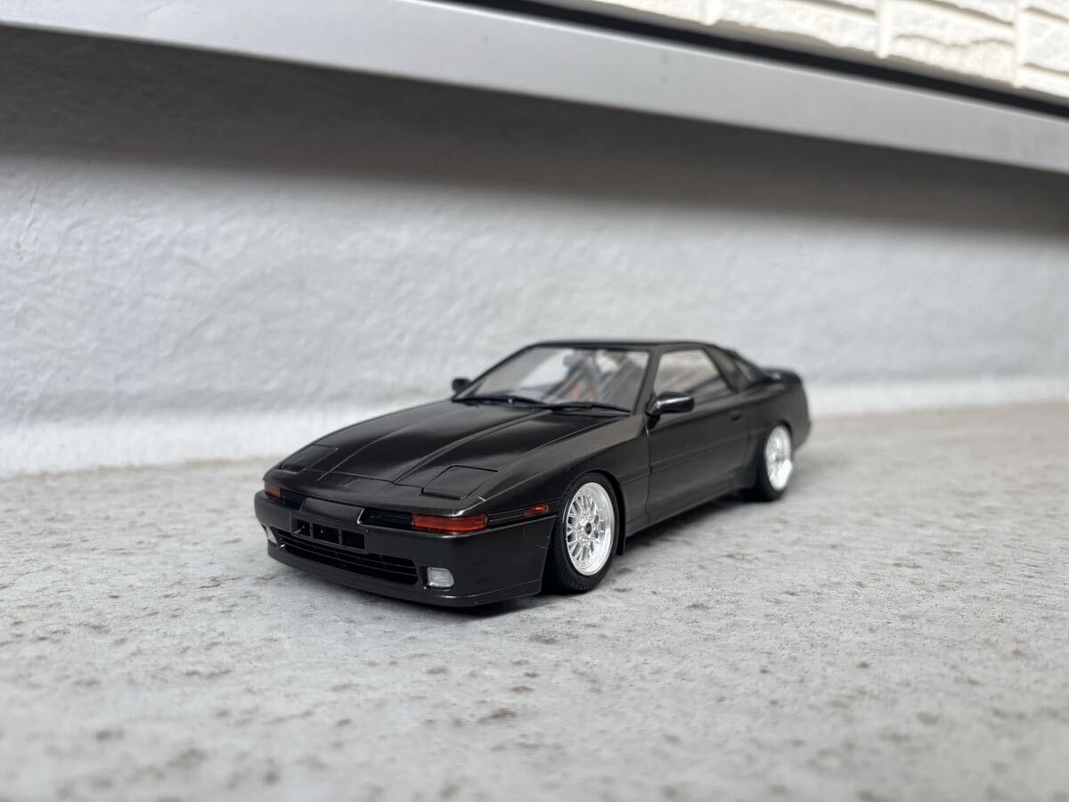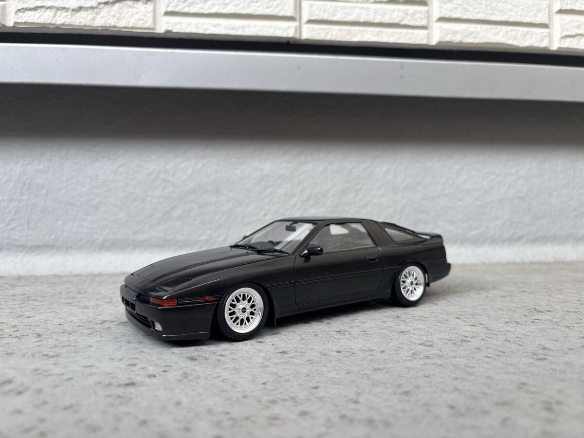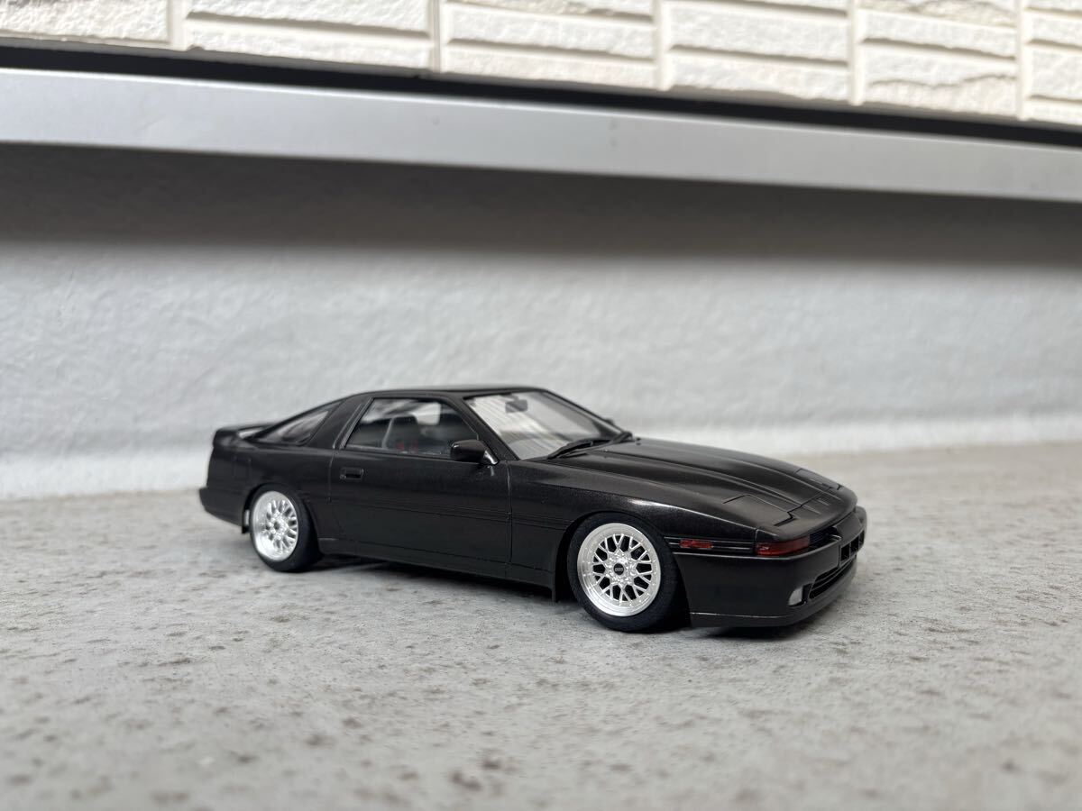 ハセガワ製、トヨタ、スープラ ターボ A70 JTC車両ベース公道仕様の完成品です。ボディカラーはメタリックブラックです。クリヤー吹き付け後に実車用ワックスにて仕上げています。 JTC車両ベースですので内装はドンガラです。自作にて車高を落としている為、多少の舵取りは可能ですが回転不可です。ホイールはアオシマ製、BBS RSIIに変更しています。付属のサイド出しマフラーは車高が低い為、取り付けていませんので同封します。素人作品の為、完璧ではありませんのでノークレーム・ノーリターンでお願いします。発送はゆうパック着払いのみとさせていただきます。また、発送中に部品等が外れてしまった場合は恐れ入りますが落札者様にて修理をお願いします。支払いはかんたん決済のみとさせて頂きます。尚、評価の悪い方、新規の方はいたずら入札防止の為、削除させて頂きます。 完成品を多数出品していますので是非そちらもご覧ください。