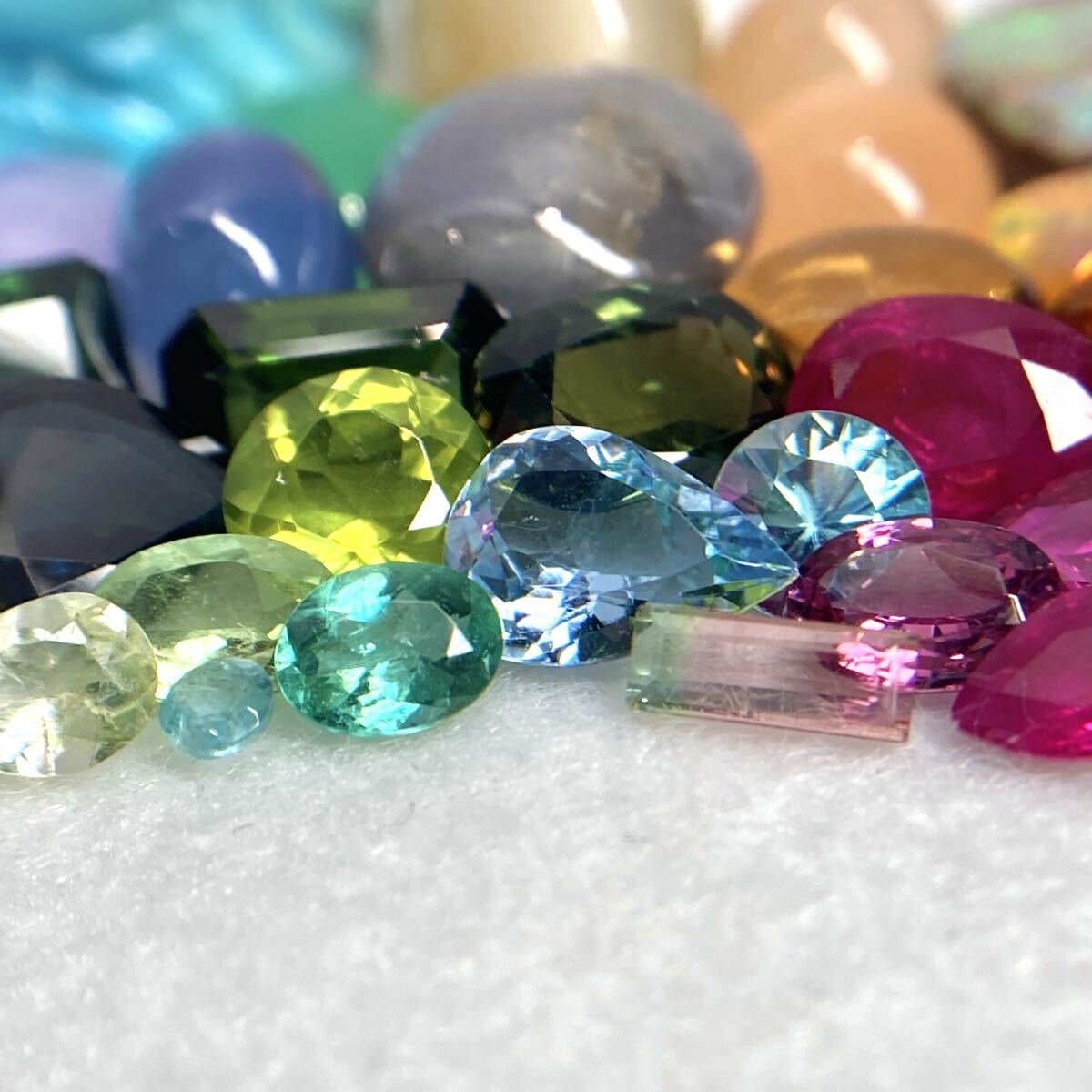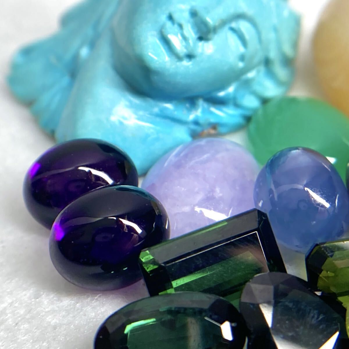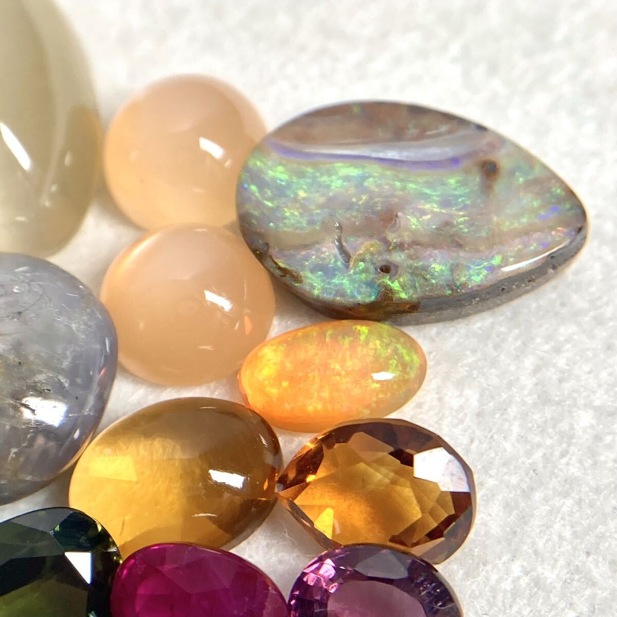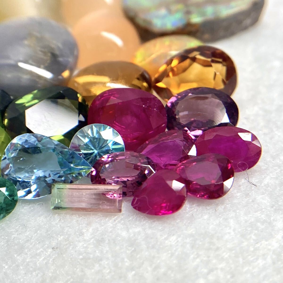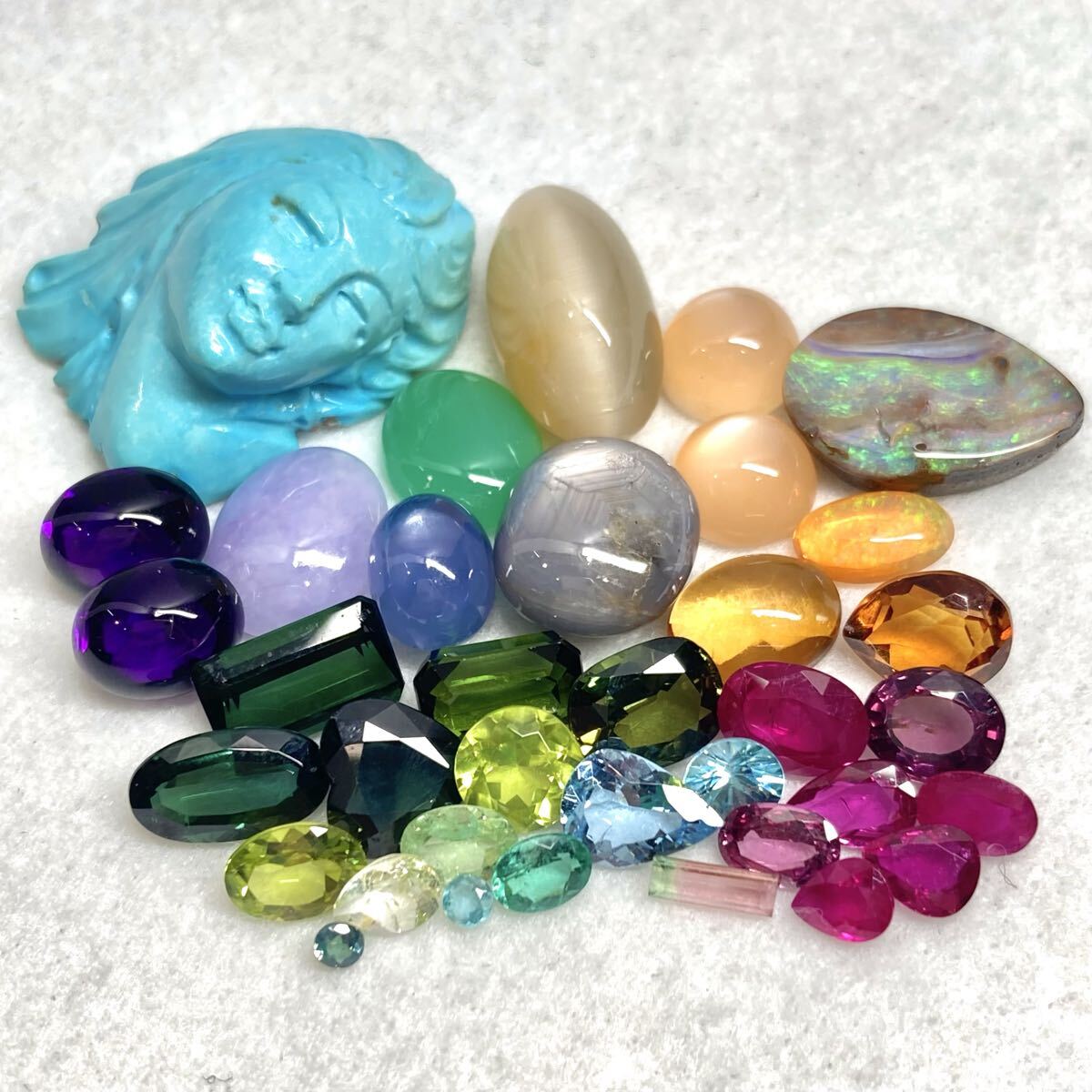 トルコ石、翡翠、クリソベリルキャッツアイ、ボルダーオパール、トルマリン、スターサファイア、シトリン、アレキサンドライト、ルビー、アクアマリン、アメジスト、ファイアオパール、ペリドット、ムーンストーン