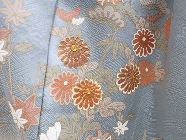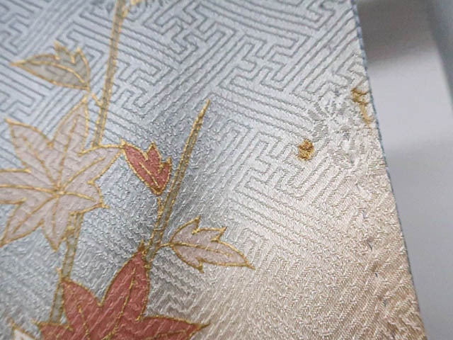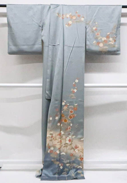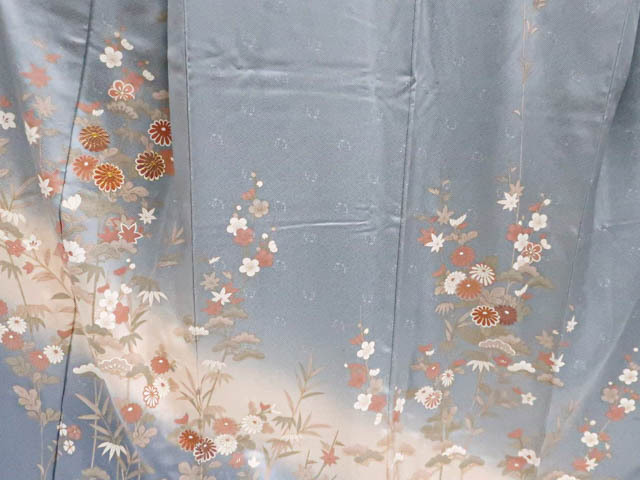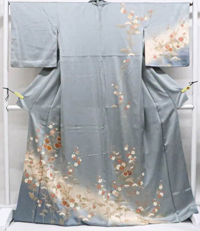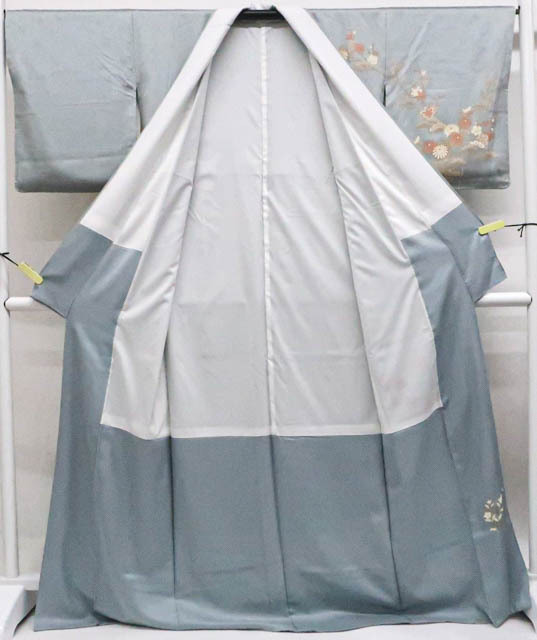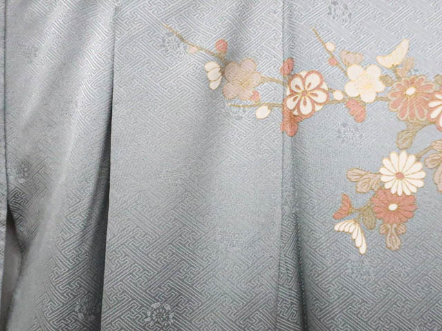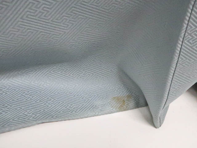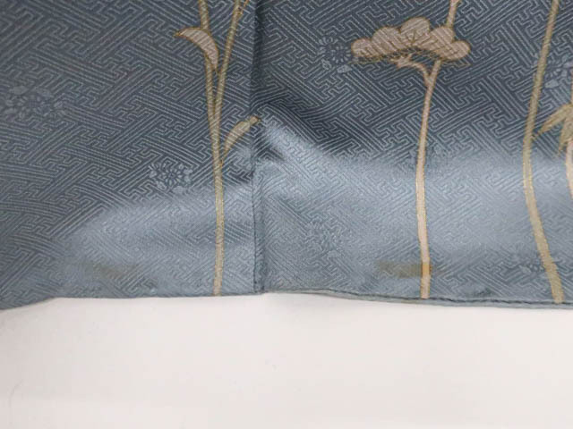 リサイクル商品のため、両袖に汚れがございます。 裏表所々しみがございますが着用可能なお品です。 地色は灰水です。 1枚目の画像が近いお色かと思われます。 素材は正絹です。 |