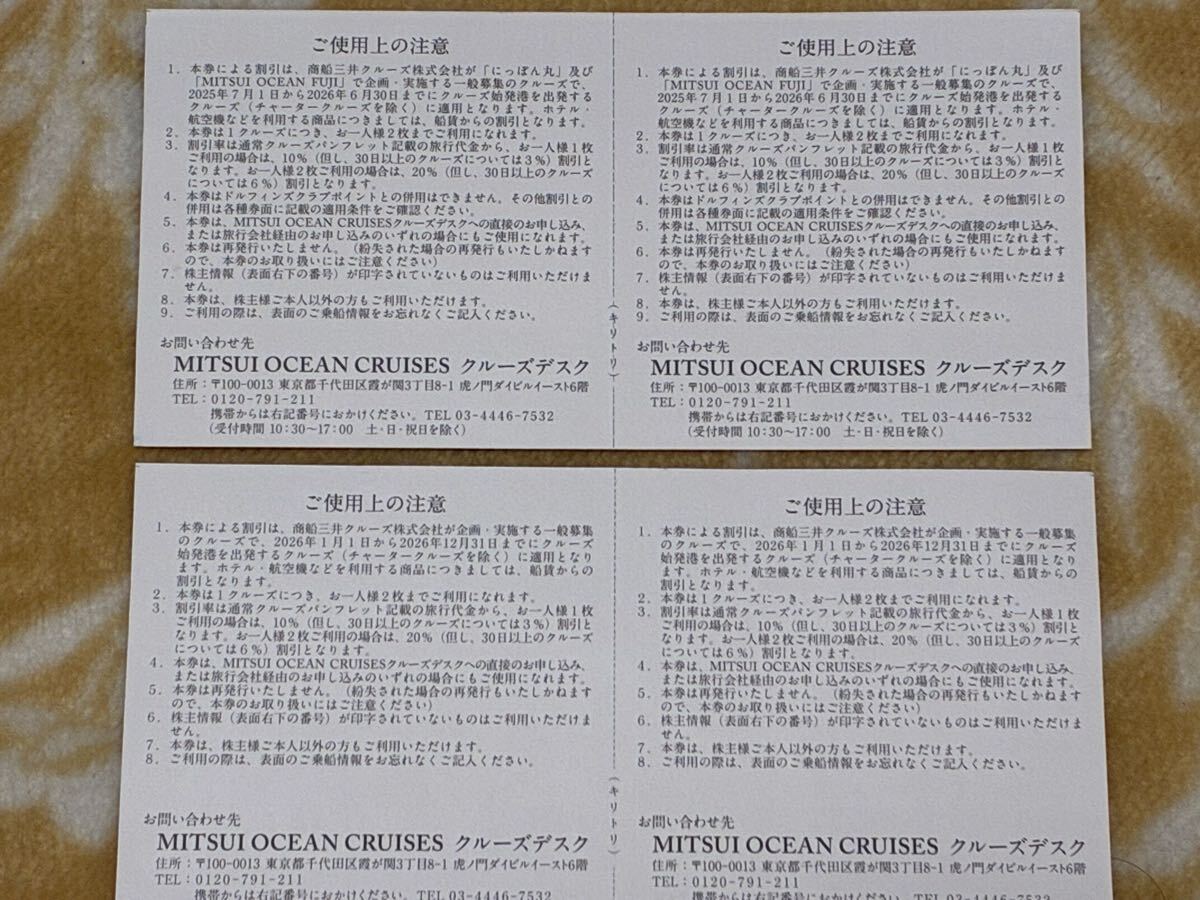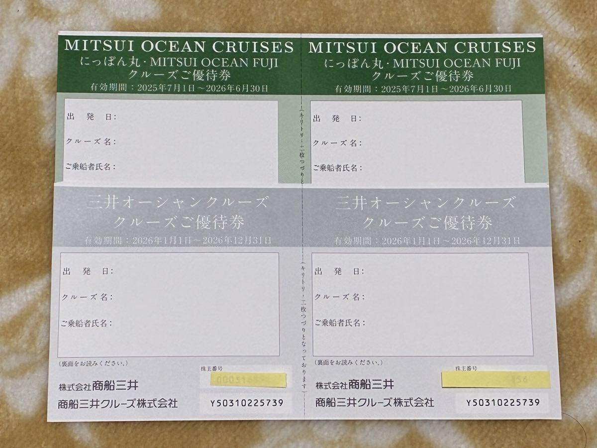 ● ①2025年7月~2026年6月 クル-ズ旅行代金10%OFF券2枚組 ②2026年1月~2026年12月 クル-ズ旅行代金10%OFF券2枚組 計 4枚 です。 ●ご優待内容 ①.本券による割引は、弊社の主催・一般募集で、クルーズ始発港を 出発するクルーズ(チャータークルーズを除く)でホテル・ 航空機などを利用する商品については、船賃からの割引となります。 ②.本券1枚で1人様1クルーズご使用になれます。 ③.★割引率は通常クルーズパンフレット記載の旅行代金から 【10%OFF】です。 2枚使用で20%OFFとなります。 ・但し、30日以上のクル-ズについては、1枚で【3%OFF】 2枚で【6%OFF】です。 ④.本券と他の優待・割引と併用できません。 ⑤.本券は弊社クルーズデスク(0120-791-211)への直接のお申し 込み、または旅行会社経由のお申し込みのいずれの場合にも ご使用になれます。 ●ホ-ムペ-ジ https://www.mitsuioceancruises.com/ |
