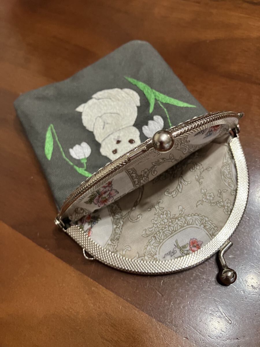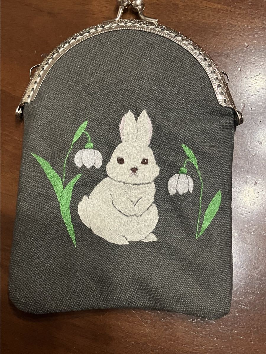 帆布生地に白うさぎとスノードロップを手刺繍しました。