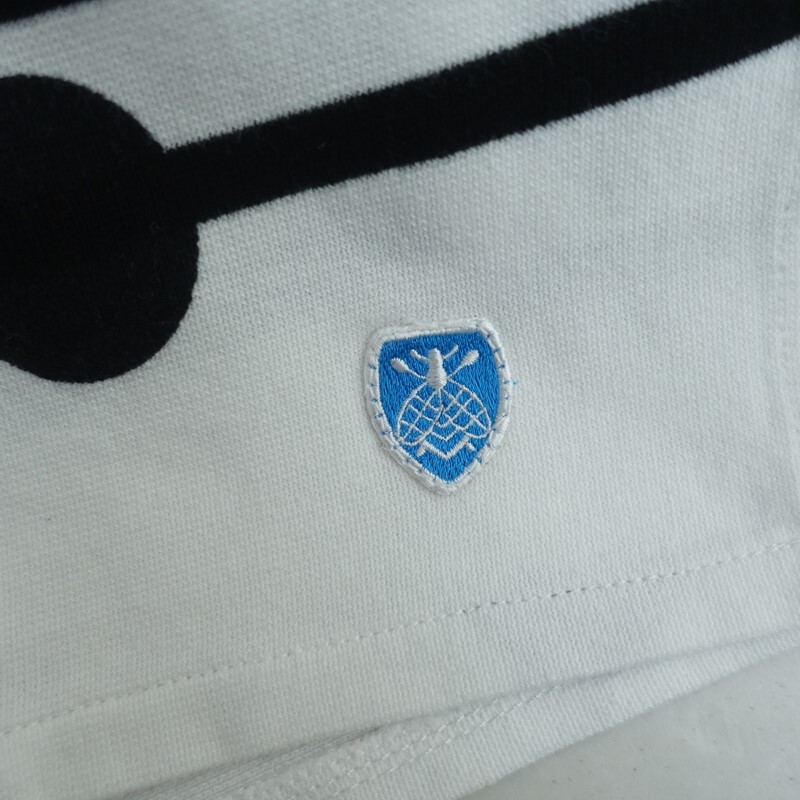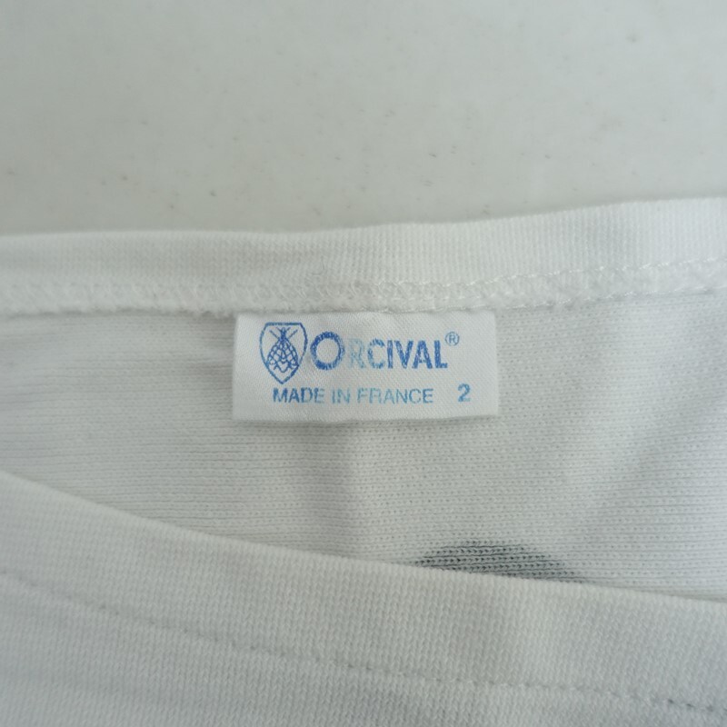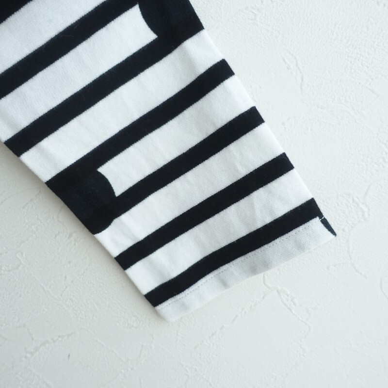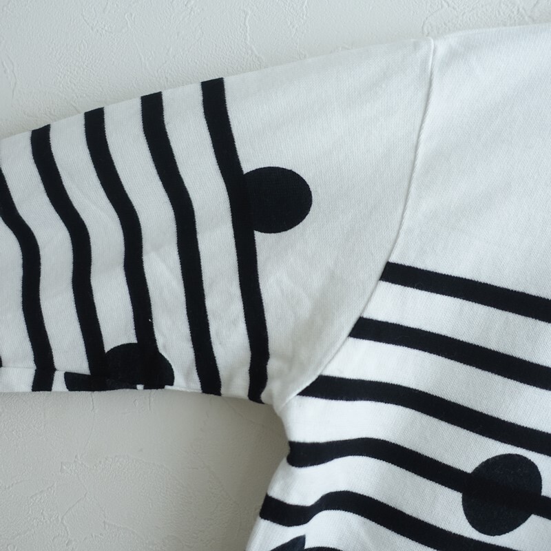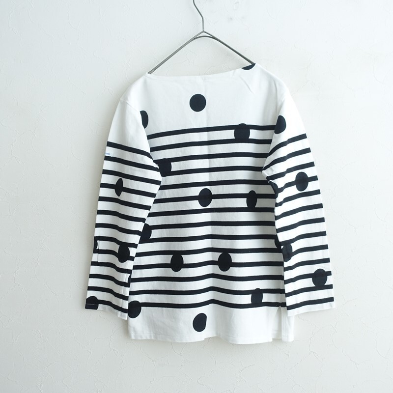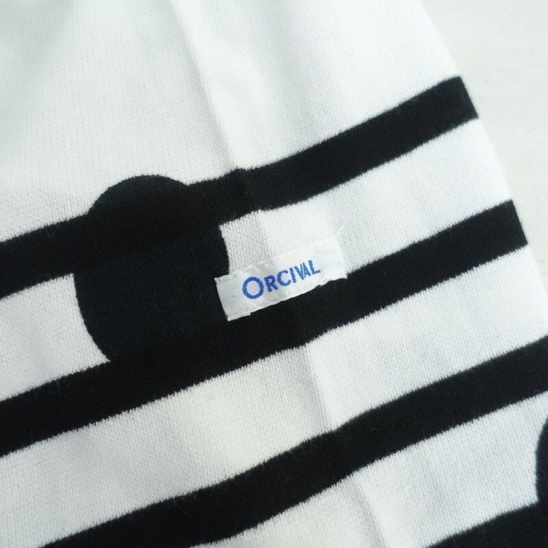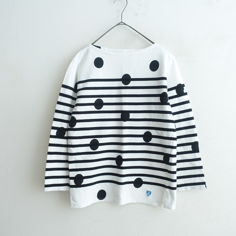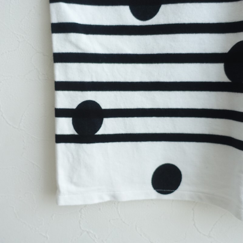 | ORCIVALのボーダー×ドットカットソーです。カラーはホワイトにブラックのボーダー&ドット柄で、ラッセル編みが施された薄手の綿ニット地です。プルオーバータイプで着脱でき、裾両サイドにスリット入りで、左袖にブランドネームタグ、前裾左にブランドワッペン付きです。 |