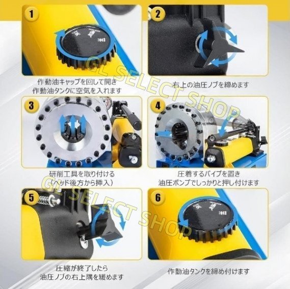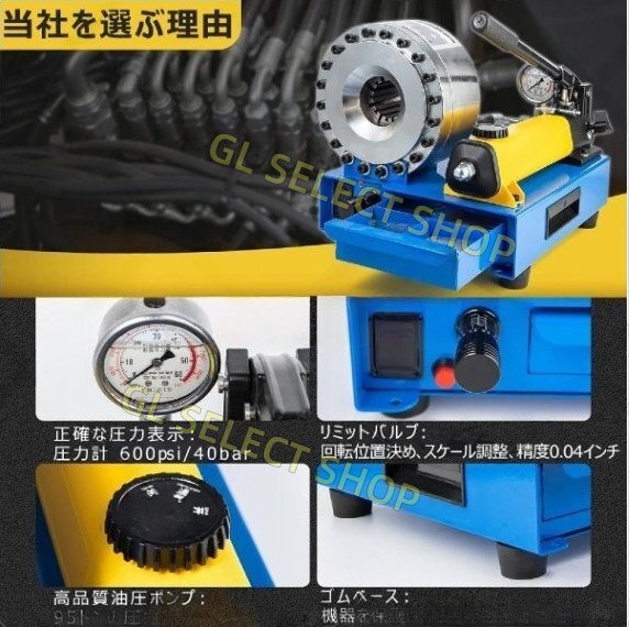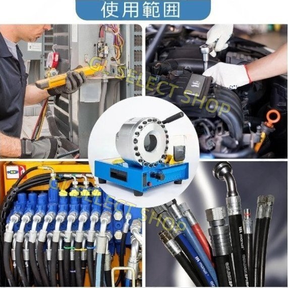 【幅広い用途】油圧チューブ圧着機は、低圧オイルパイプ、エアパイプ、水道管、ケーブルジョイント、自動車エアコンホース、自動車パワーステアリングホースなど、さまざまなゴムホースや編組ホースの圧着に適しています。車両、建設機械、油圧機械、溶接・切断装置などの業界で幅広く使用できます。