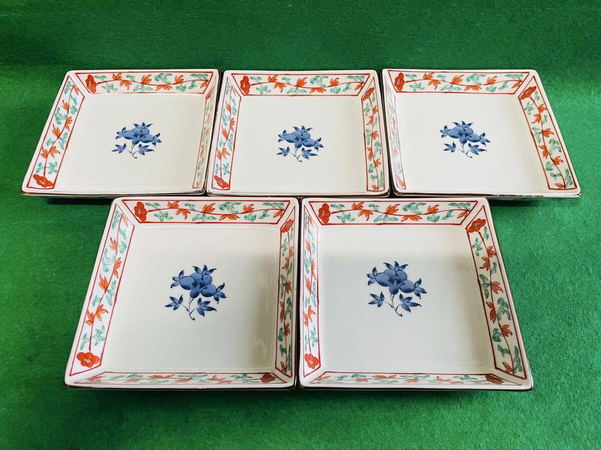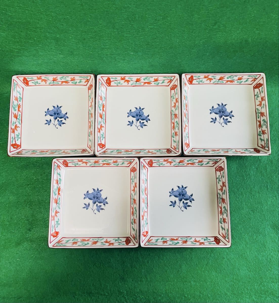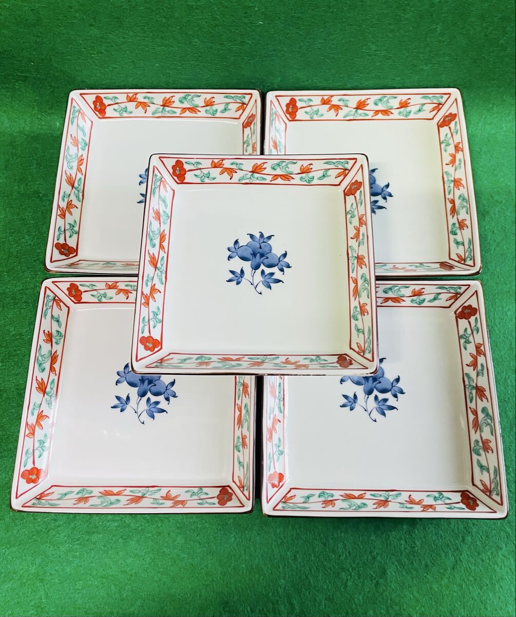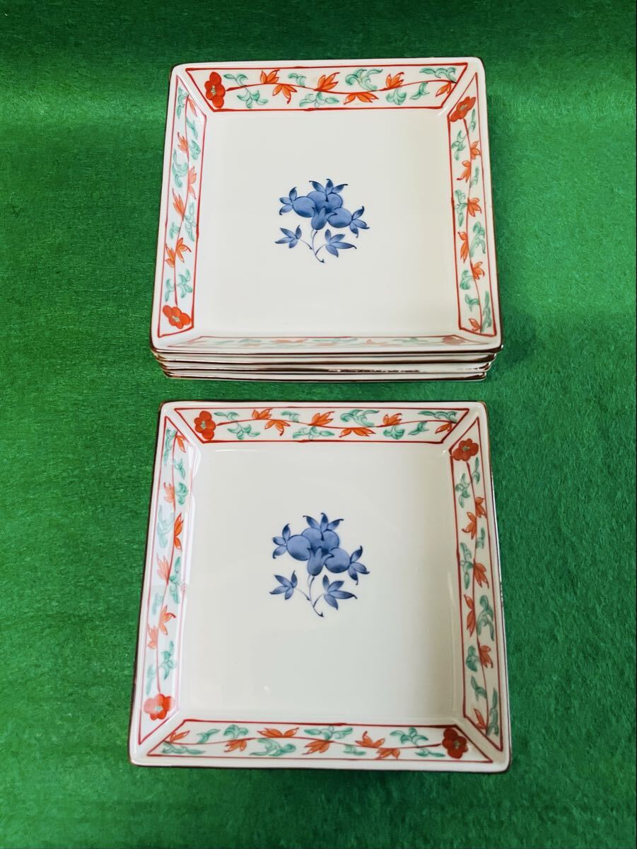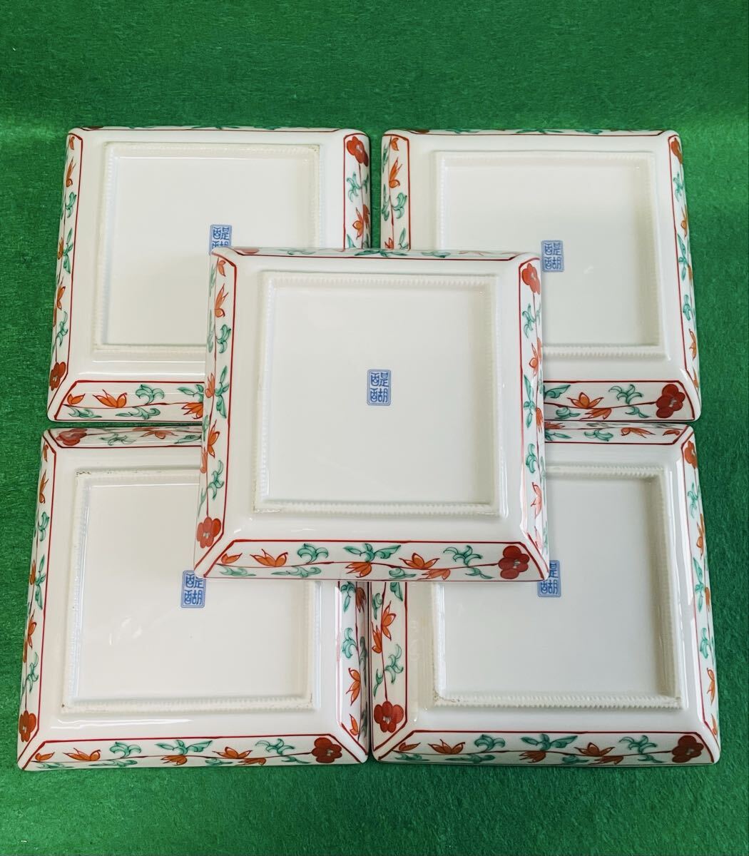 有田焼醍醐窯赤絵花柄四角皿五枚セットになります。長年自宅保管していました。少し汚れや擦り傷などあります。御理解いただける方よろしくお願いします。素人寸法になります。