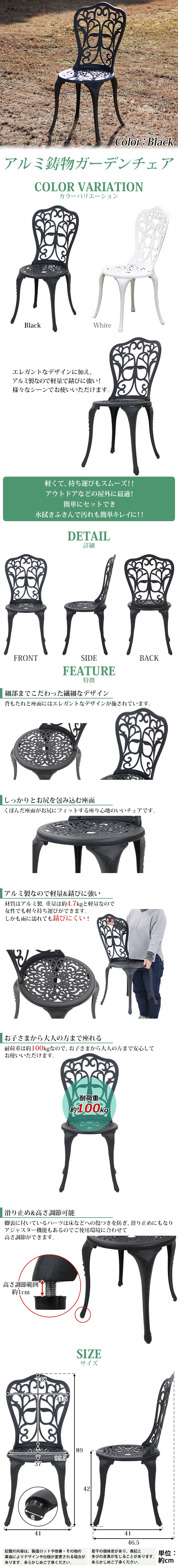 | 商品名 | 送料無料 アルミ鋳物ガーデンチェア ブラック アルミガーデンチェア 軽量で持ち運び簡単 エレガント ガーデンファニチャー ガーデンチェア アルミ チェア キャンプチェア アルミチェア アウトドア 庭 バルコニー テラス 屋外 家具 ファニチャー 鋳物 黒 almimncha36bk |