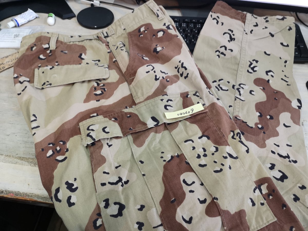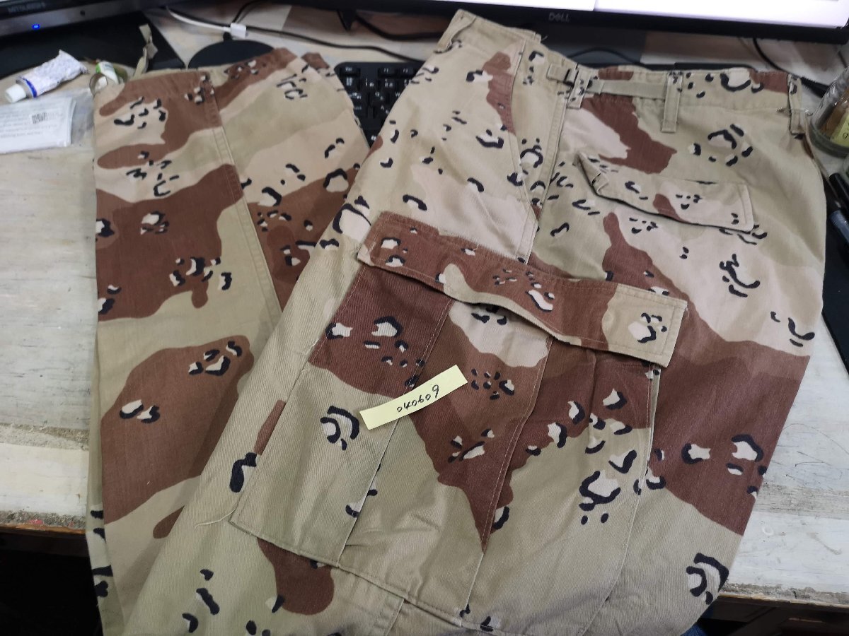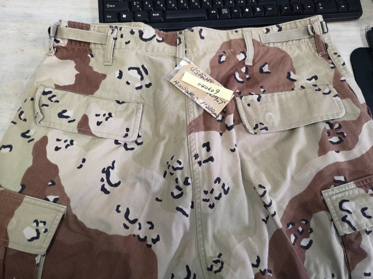 米軍実物のチョコチップのBDUパンツ、中古が入荷しました。 米軍にて湾岸戦時に採用された「チョコチップ」と呼ばれる米軍の6Cデザートカモ柄のBDUパンツです。 その名の通り6色の色合いからなるカモフラージュパターンで、 生地はノンリップの「NYCOナイコ(ナイロン、コットン)が採用されており丈夫な作りです。 近年、入手困難で価格も高騰してきているアイテムです! フロントはボタン開閉仕様で、両サイドのアジャスターでウエストサイズが調整可能です。 ポケットは、サイド・バック・カーゴ左右それぞれに配置され、計6つのポケットがあります。 存在感のある1枚で、合わせる色味や素材でアレンジを楽しめます。 サイズはUSサイズのM-Lです。ウエスト90cm / 総丈120cm / 股下90cm程度でアジャスターでもう少し絞れます。 素材はノンリップのコットン50%、ナイロン50%の丈夫な生地。 沖縄離島を除く全国元払い500円でお送りいたします。落札価格にプラスでお願いします。