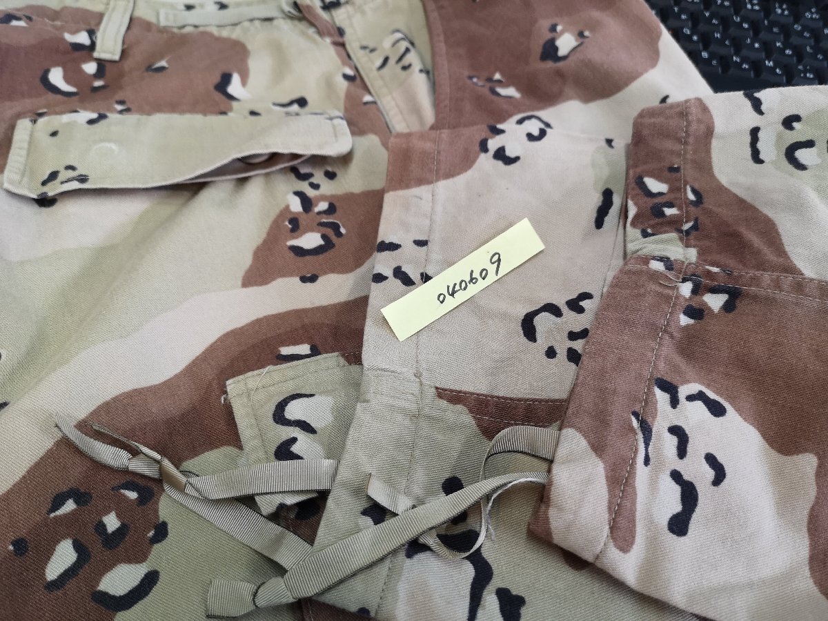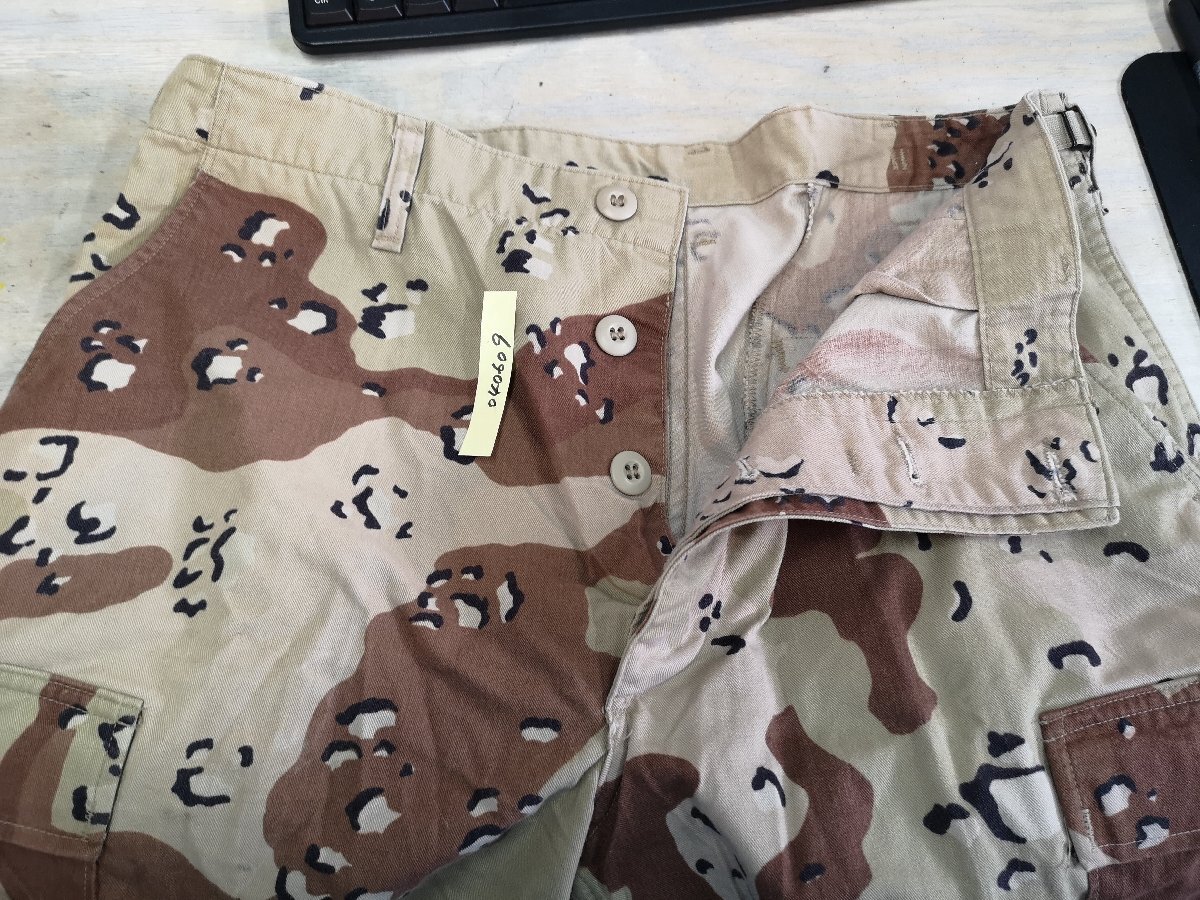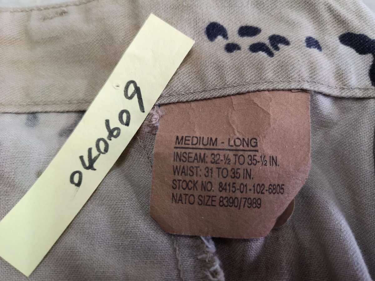 米軍実物のチョコチップのBDUパンツ、中古が入荷しました。 米軍にて湾岸戦時に採用された「チョコチップ」と呼ばれる米軍の6Cデザートカモ柄のBDUパンツです。 その名の通り6色の色合いからなるカモフラージュパターンで、 生地はノンリップの「NYCOナイコ(ナイロン、コットン)が採用されており丈夫な作りです。 近年、入手困難で価格も高騰してきているアイテムです! フロントはボタン開閉仕様で、両サイドのアジャスターでウエストサイズが調整可能です。 ポケットは、サイド・バック・カーゴ左右それぞれに配置され、計6つのポケットがあります。 存在感のある1枚で、合わせる色味や素材でアレンジを楽しめます。 サイズはUSサイズのM-Lです。ウエスト90cm / 総丈120cm / 股下90cm程度でアジャスターでもう少し絞れます。 素材はノンリップのコットン50%、ナイロン50%の丈夫な生地。 沖縄離島を除く全国元払い500円でお送りいたします。落札価格にプラスでお願いします。