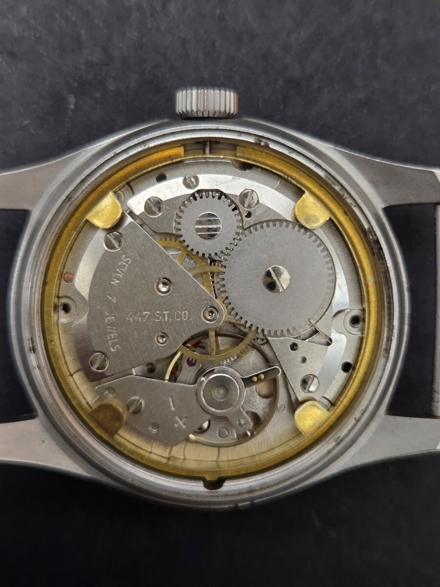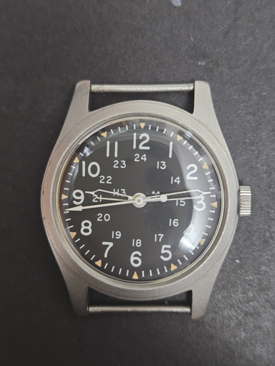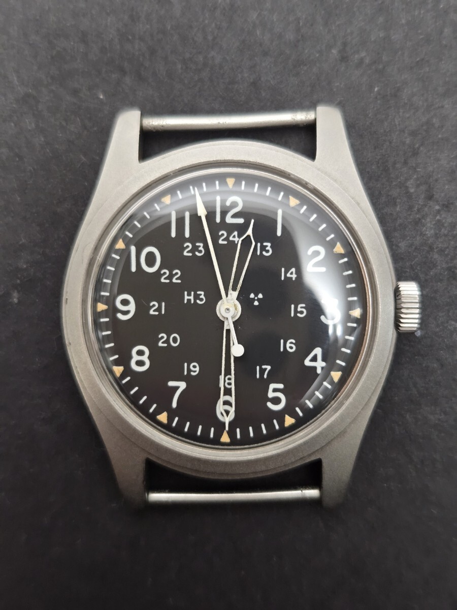 1978年製のHamilton MIL-W-46374Bです。初期の方になると思います。市場には、1980年代の物が多く出回っておりますが、今回の個体は希少な初期モデルです。初期と後期で、文字盤のフォントに違いがあり、初期の方が微妙に細いです。(確実な情報ではありませんが、市場に出ている物を比較すると違いがありました。)また、ムーブメントは447を積んでいます。(後期モデルには466が積まれています。)