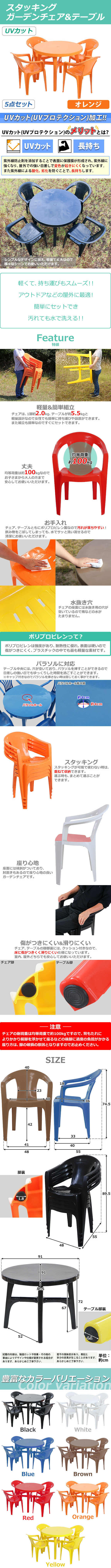 ●UVカット加工によって屋外での強い日差しで変色しにくくなっています。 ●紫外線による酸化、劣化を防ぐことにより、長持ちする作りになっています。 ●ガーデンチェアは、スタッキング構造なので重ねる事が可能なので、収納やまとめて運ぶ際にも大変便利です。 ●テーブル中央にパラソルなど、設置可能な穴があります。 ●テーブルは、簡単な組み立て式になります。チェアは、完成品です。 ●チェアは1脚約2kg、テーブルは約5.5kgと軽量なので、女性でも軽々持ち運べます。 ●材質は、軽量、安全、防水のポリプロピレン(PP)です。 注意! 背もたれによりかかり前脚を浮かせて座るなどの後脚に過度の負担がかかる座り方は脚の破損の原因となりますのでお止めください。 ■重量(チェア):約2kg(1脚あたり) ■耐荷重(チェア):約100kg(1脚あたり) ■重量(テーブル):約5.5kg ■耐荷重(テーブル):約100kg ■材質:PP[ポリプロピレン](チェア、テーブル)、ゴム(チェア脚裏)、PVC(テーブル脚裏) ●商品のカラーはオレンジとなります。 ●新品商品ではありますが、輸入商品の為、多少の擦り傷などがある場合がございますので、ご納得の上ご購入下さいませ。 ●ご購入後、お客様ご都合によるご返品、ご返金等は一切お受け致しておりません。 ●本商品を使用した際に発生したトラブル、事故につきまして、当社は一切の責任を負いません。ご使用に関しましては、全て自己責任にてお願い致します。 |