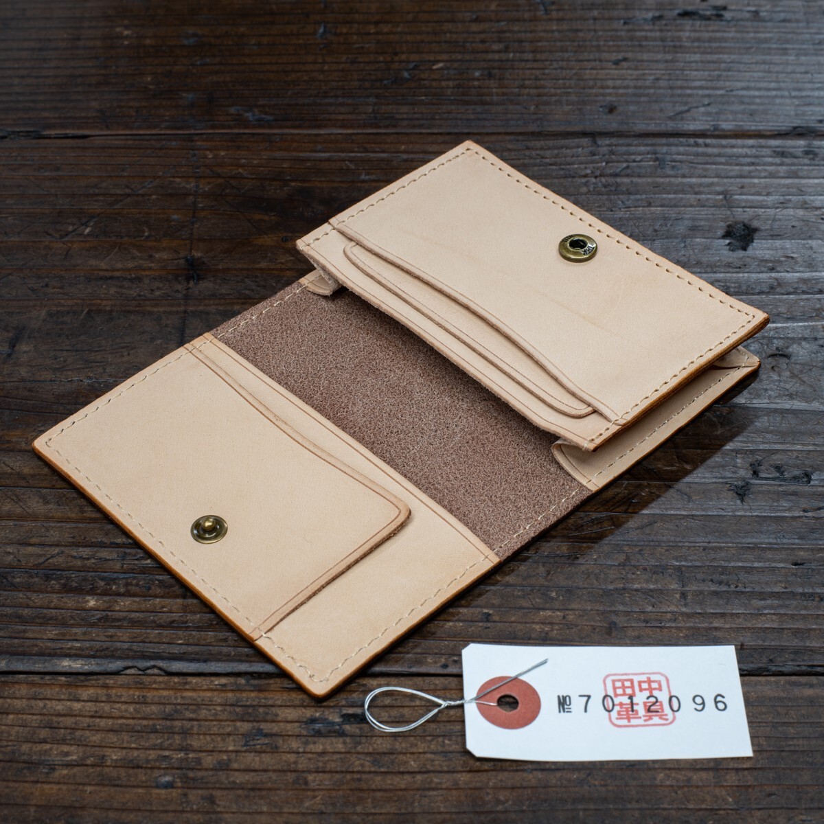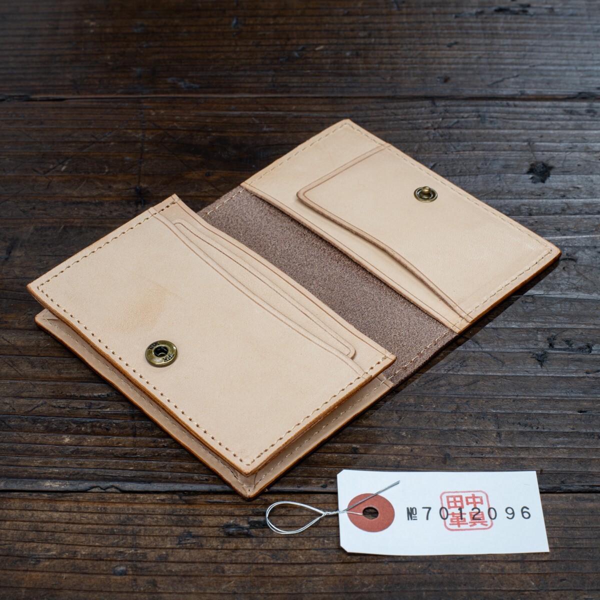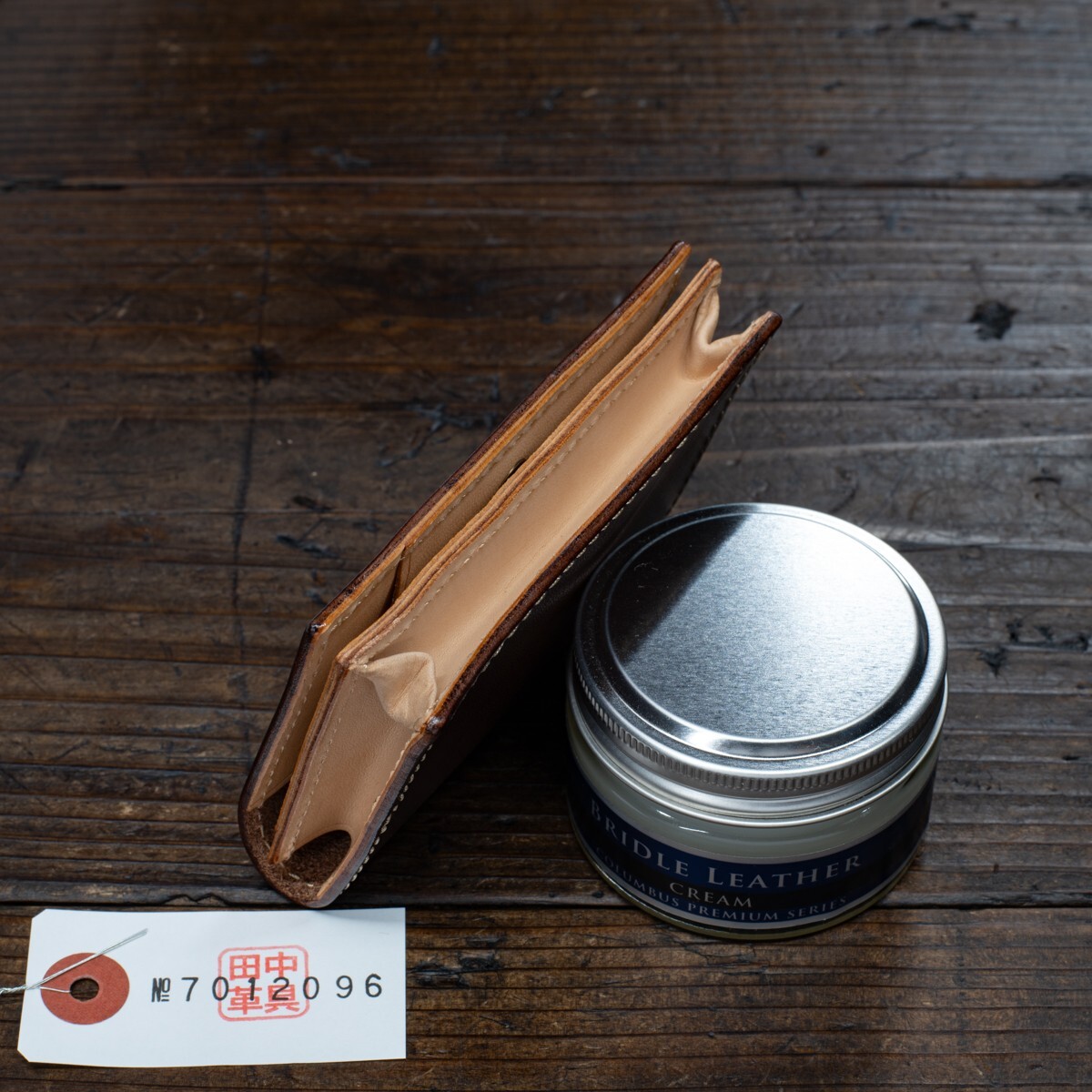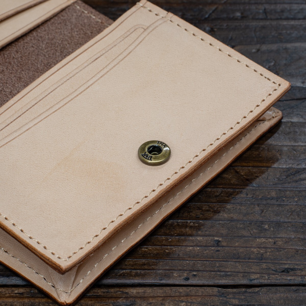 縁まわりはコバを丁寧に磨いて仕上げており、見た目の美しさだけでなく、革の断面からの劣化も防いでいます。ホックには阿部ハトメ社製の「THKホック」を採用し、バネがへたりにくく、しっかり留まる安心感があります。