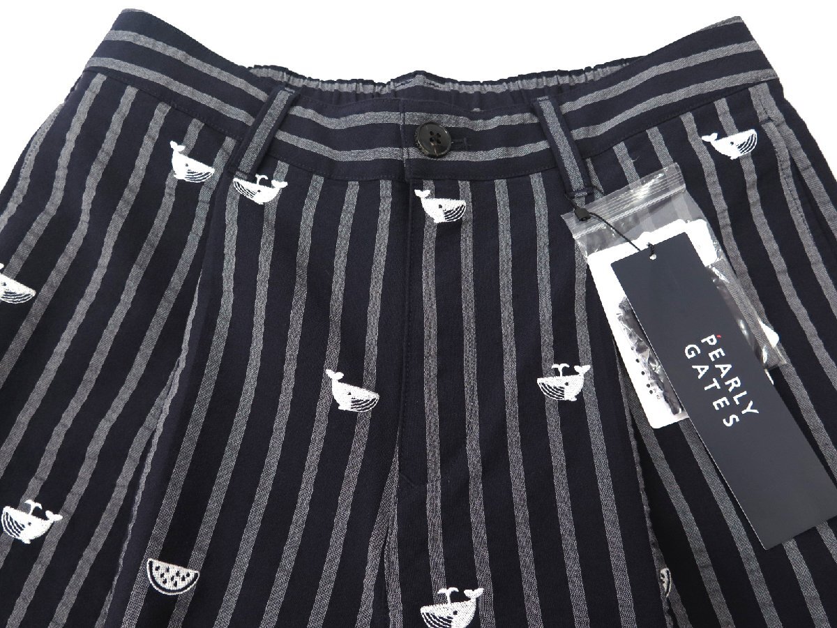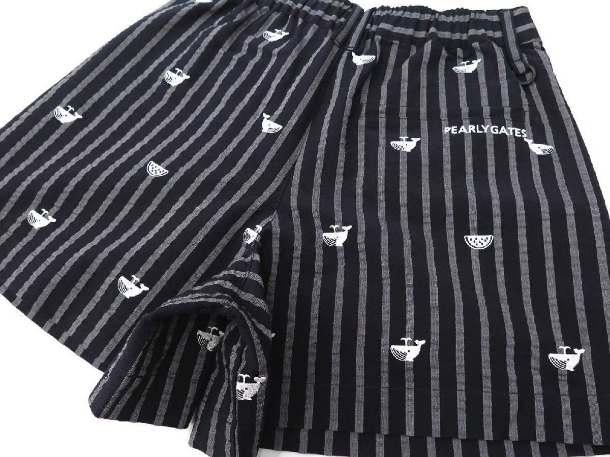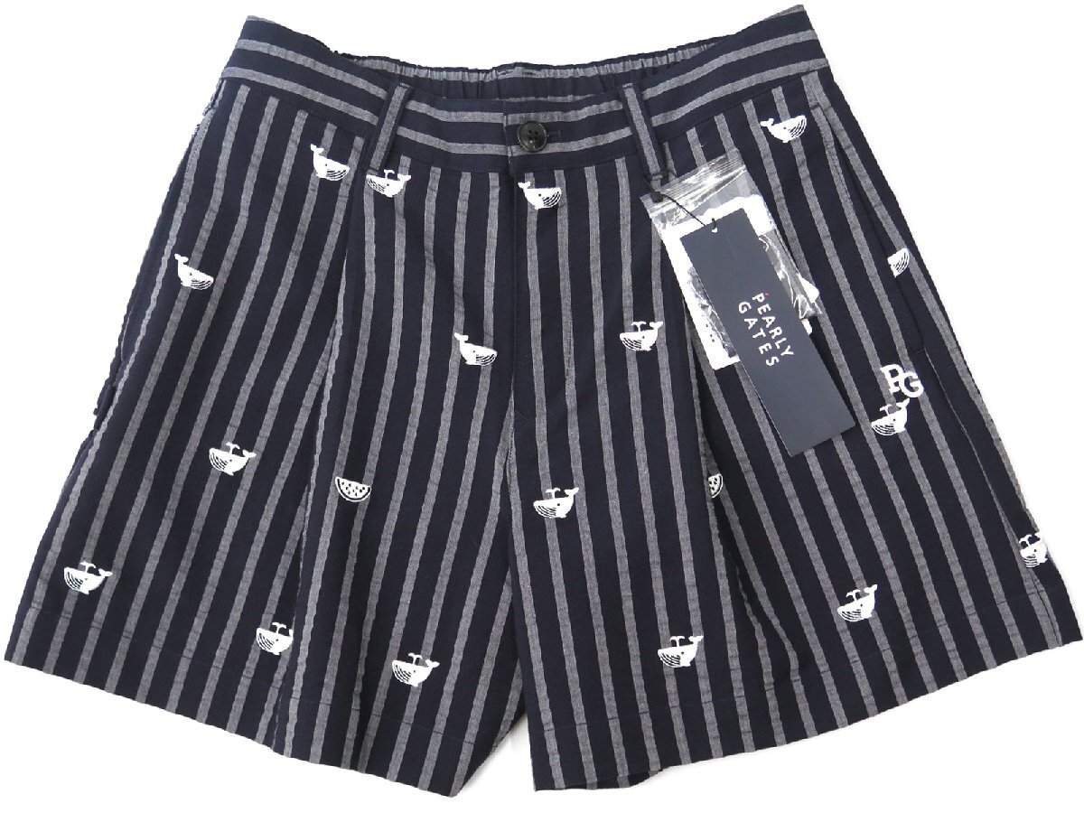 商品名● PEARLY GATES パーリーゲイツ ●新品 【クジラ&スイカ刺繍】 サッカーストライプ ストレッチ キュロット 濃紺/S 定価30800円