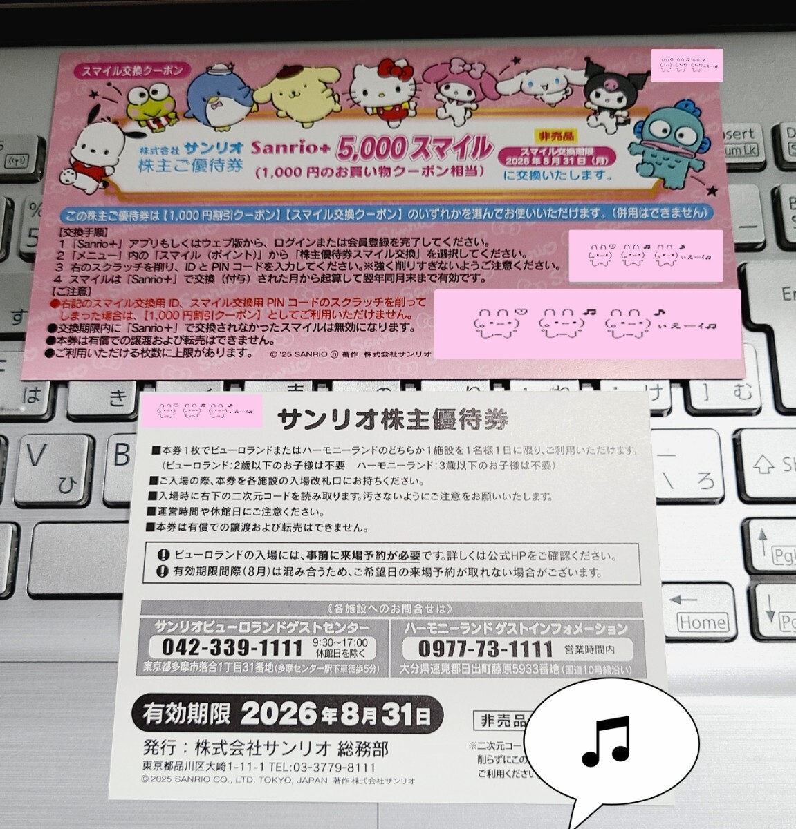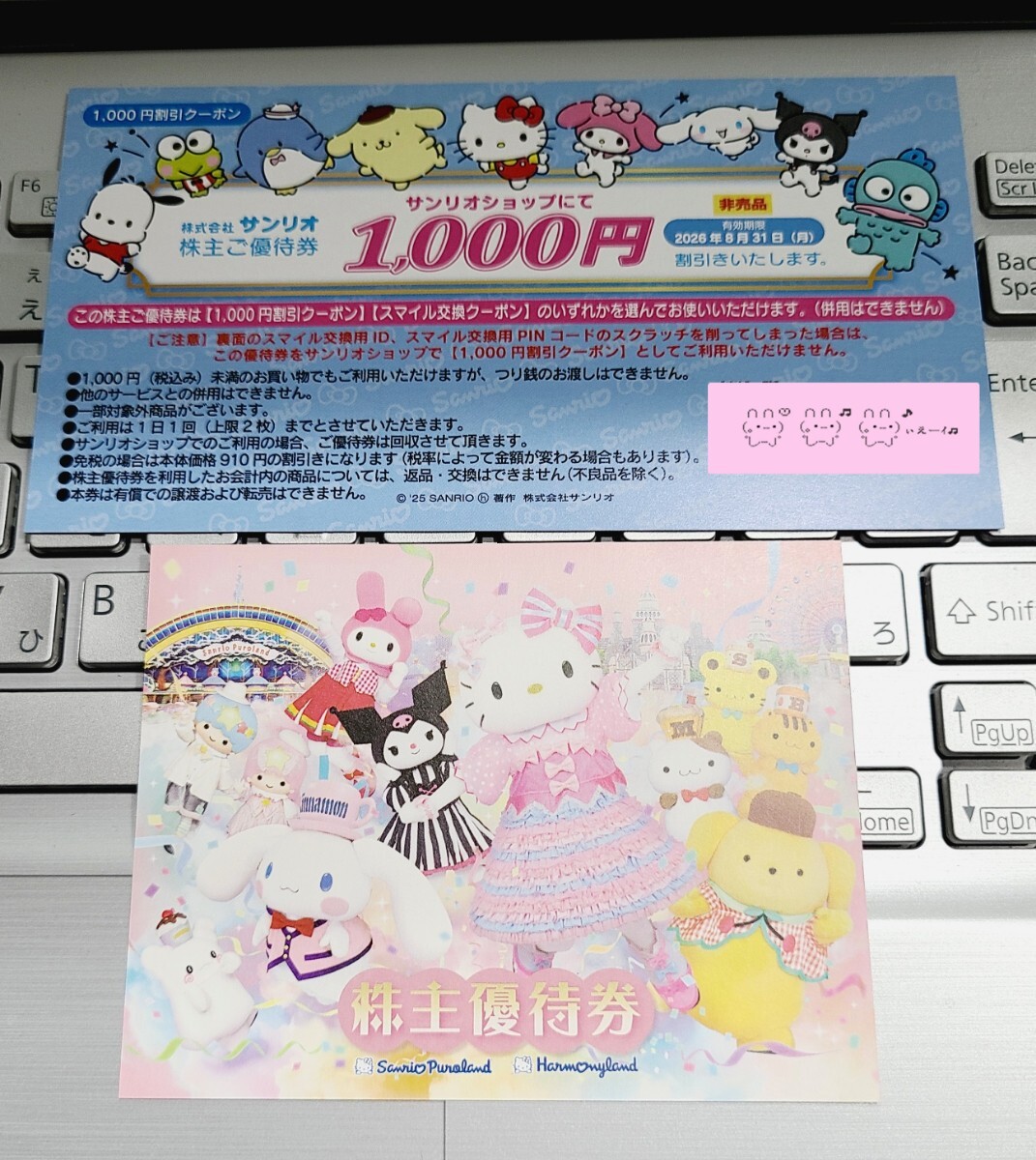 サンリオ 株主優待 サンリオピューロランド利用券1枚+ショップ1000円割引券1枚 有効期限2026/8/31